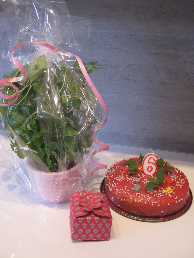 Vanlig sockerkaka på vatten och mjölkfritt margarin, citronarom och röd karamellfärg. Vanlig glasyr, även den med citronarom och röd karamellfärg. Dekoration från ICA och citronmeliss. Ge-bort-blomman citronmeliss.
