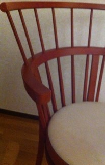 Det här är en provstol som blivit över, och alla mer eller mindre frekventa gäster har lärt sig att hos mig är pinnstolen vinstlotten. Den bärs runt mellan vardagsrummet och köket, och ibland flyttar jag den till arbetsbordet. Det händer ofta att jag sätter mig i den och läser, hellre än i soffan.