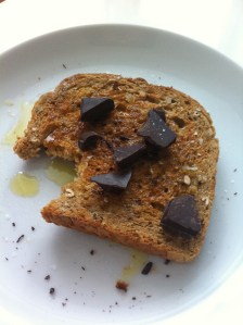 En av få saker jag ätit idag, min favoritefterrätt/fika som jag åt för första gången i Barcelona. Rostat bröd, olivolja, mörk choklad och flingsalt.