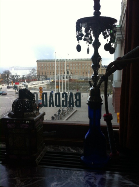 hann med en kaffe på café Bagdad också, som ligger i medelhavsmuseet, nära slottet som synes