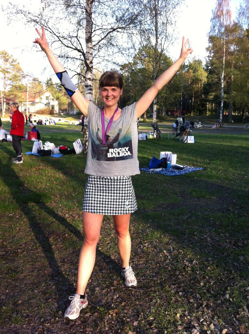 Premiär för löpkjolen och tro det eller ej, men det var faktiskt så varmt att den gick ha utan tajts under. Urskön faktiskt! Kanske framförallt snygg? Inte kände jag att det var en kjol iallafall. Som bekant ingen materiallöpare (lever efter filosofin att man ska inte behöva ha dyr utrustning för att ha kul och också prestera bra. Även om det kanske hjälper…) och den här löparkjolen är, förutom mina för i år nya skidkläder, det enda funktionsplagg jag äger tror jag. Kan lika gärna ta något annorlunda då. När vi pratade ihop oss på jobbet och de sa de skulle springa i ”löpar-T-shirt” sa jag att jag också skulle det. Det är ju ROCKY på den!!?! Tydligen ändå inte precis en sån de menade…