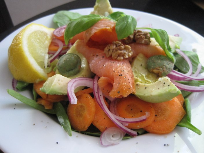 Bovete*, Baby(-/blad-)spenat, Grovt rivna eller skivade morötter, Avocado i båtar, Wasabinötter**, Lax, tunna rödlöksringar, ***, Valnötter, en citronklyfta, Flingsalt, (Citron)peppar, Chiliolja****