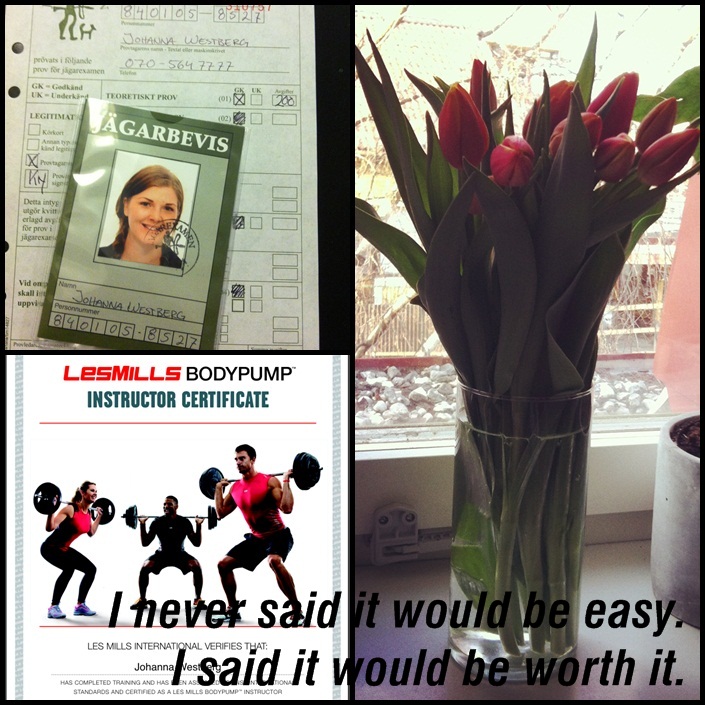 I januari började jag hoppa på chans efter chans som jag velat göra, kände jag inte kunde tacka nej. Först anmälde jag mig till jägarskolan, för att lära mig mer om naturen, för att kunna uppleva och uppskatta än mer de kära fjäll jag så gärna åker hem till och förhoppningsvis slippa stödja köttproduktion men ändå äta köttfärssås och grilla. Sedan kom ett mejl med att det fanns en reservplats på skidskolan, först till kvarn. Såklart jag var först till kvarn! Fem underbara onsdagkvällar hade vi. Utöver tisdagarna som var jägarskolan då alltså. På jobbet dök det upp en kurs till processledare i hållbar stadsutveckling – här var den, kursen och rollen som skulle passa mig som handen i handsken. Deltagare och lärare/föreläsare jag känner väl till och en uppmuntrande chef. Jag fortsatte jobba lite extra som hudvårdskonsult men SPA-klasserna har inte lockat så många i år trots väldigt nöjda kunder bland de som deltagit och hips vips frågar mina kollegor på simhallen om jag inte skulle bli instruktör istället. Jag som alltid fantiserat om att bli BodyPump-instruktör. Jag har tänkt att kanske jag borde hålla träningen på hobbynivå så jag inte bara drar på mig ett måste, men jag har samtidigt hela tiden tänkt att jag skulle nog faktiskt både trivas och passa rätt bra därframme. År av ungdomstränare och hudvårdsklasser samt eget bodypumpande gör att platsen där framme känns helt naturlig. Självklart tog jag chansen och åkte ner en helg i slutet av januari. Godkänd. Bara att lära sig hela passet, hålla några klasser själv och filma för licensen. Kändes svårt och pirrigt men inte en tanke på att jag inte skulle fixa det. So far, so good. Extrajobbet som hudvårdskonsult fasade ut sig själv allt mer och jag kände att jag prioriterade hellre annat. Allt har sin tid.