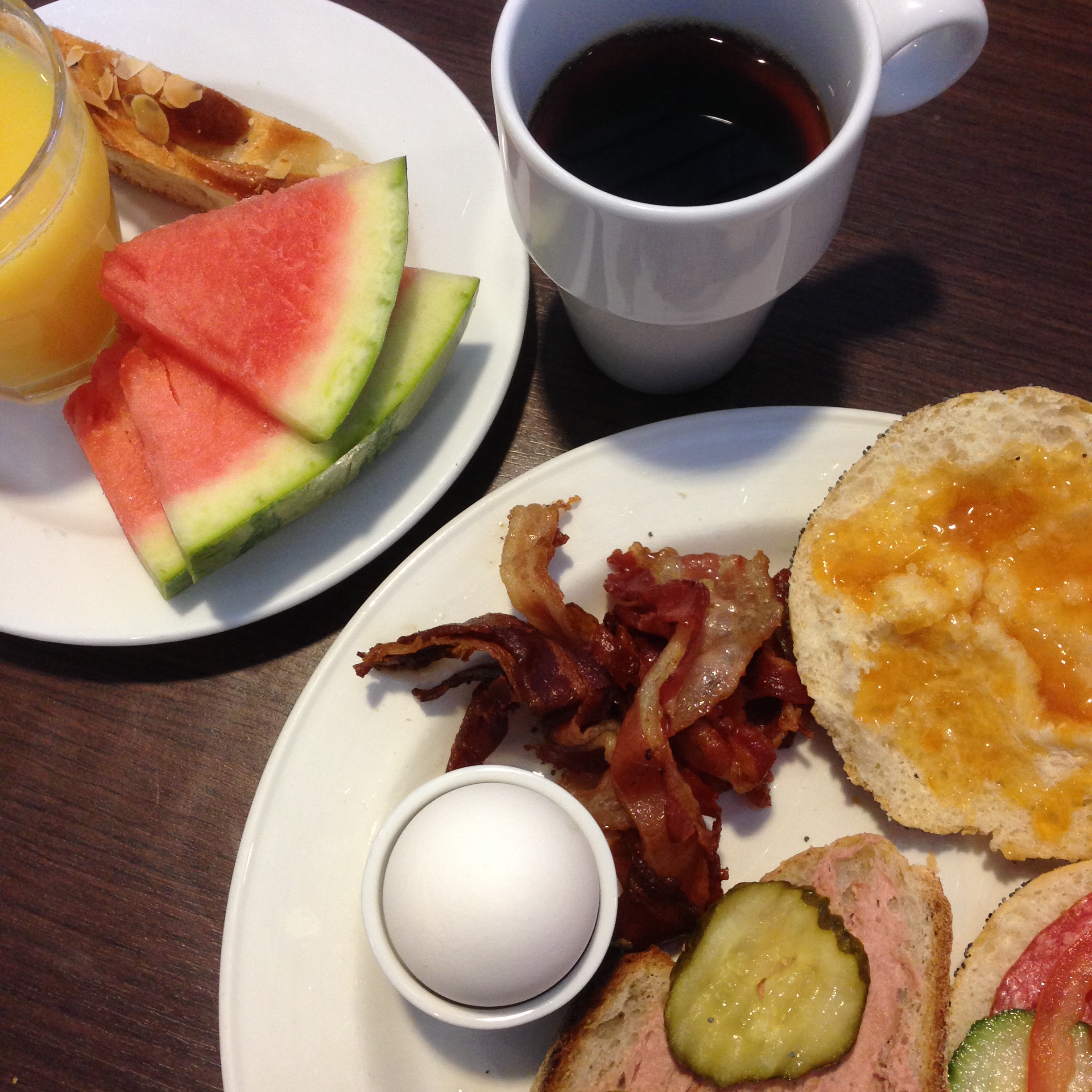 Frukosten är fantastisk och jag äter i mängder och mina tidigare studier har hållit den ena kedjan som favorit eftersom de har våfflor (som det är mjölk i men ändå) och färskpressad apelsinjuice men den andra där vi bor nu har en hel liten avdelning framställd med mjölkfria alternativ som margarin, soygurt m.m. och majoriteten av frukostbuffén är ekologisk. HURRA!