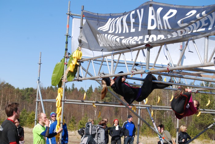 Armstyrka/överkroppsstyrka aldrig varit min starka sida så det blev några penalty rounds. Första dipsgången slant jag och slog i knät i ställningen dessutom så det var lite ömt springa resten och det vankas nog ett blåmärke men det hör ju till och nästa dipsgång satte jag. Monkeybar och ringar klarade jag inte hela, inte heller repet rakt upp. Trapetserna testade jag faktiskt inte ens för de var i slutet och jag var toktrött och vi hade stått innan och kollat och nästan ingen klarade dem. Sista monkeybaren hade jag kramp i vaderna men klängde mig fast och fixade den. Den och lianerna i skogen där vi skulle svinga oss från en högre platå till en lägre i ett slemmigt rep gav definitivt högst adrenalinrush.
