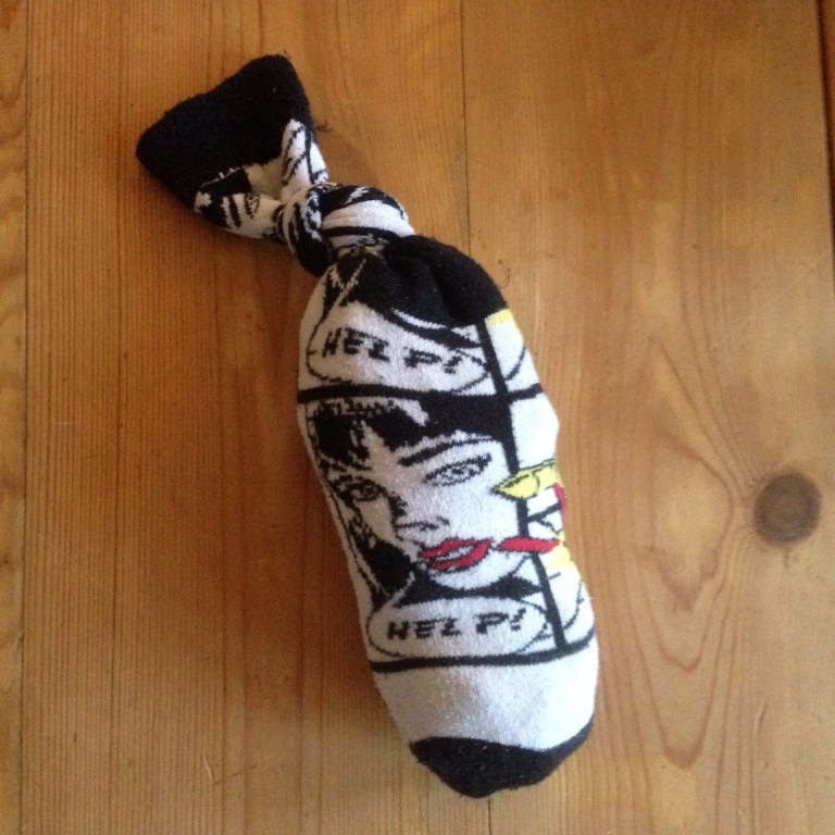 Jag är bjuden på fyraårskalas ikväll och det är vansinnigt vad tiden går, det är vår lilla valp som fyller fyra! Bra anledning ses tycker vi alla i hennes flock. Hon ska få en hemmagjord present, ett bra tips för att göra sig av med gamla udda strumpor som visat sig inte vara bara tillfälligt singlar utan änkor utan hopp om ny partner. Jag kallar konstverket ”en strumpa som luktar mig fylld av strumpor som luktar mig”. Inslagen med hundgodis i papper förstås!