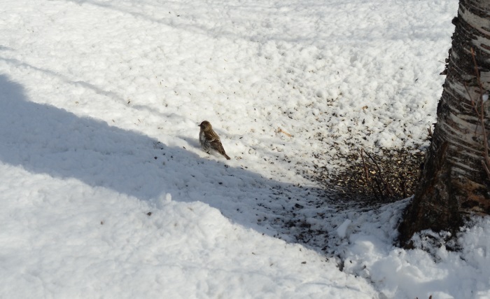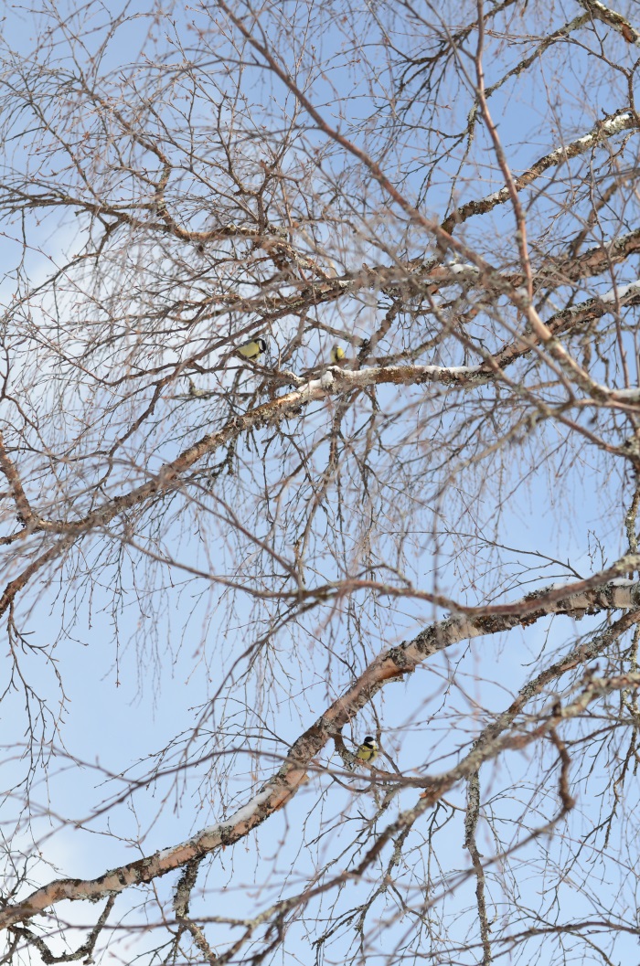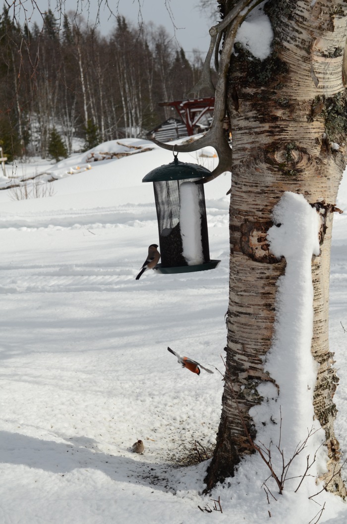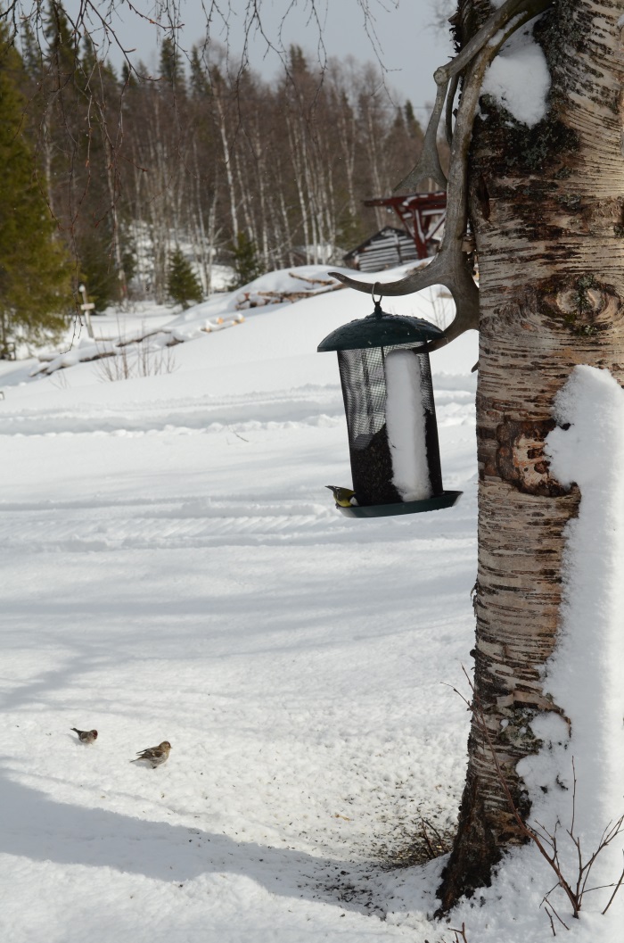 Har ni nånsin tänkt på hur det låter efter en snöstorm? Det är samma efter regn på sommaren, först hörs bara vädrets ljud och oljud men direkt när det lugnar ner sig sätter fåglarna igång den allra vackraste kör. De tar i som om de skulle ropa till hela världen att nu är stormen över. Jag tycker det är så häftigt och det är sånt som är lätt att inte hinna lägga märke till i vardagens sus och dus. Idag gick jag ut i en lugn period mitt på dagen och ställde mig vid fågelbordet och bara tittade och lyssnade. Nu sitter jag på kvällskvisten, det snöar fortfarande men det blåser inte stormbyar längre, och tittar i fågelboken för att se vilka fåglar det var som åt vid moster och morbrors fågelbord idag. Det var längesen jag tränade på att känna igen fåglar och det var hopplöst att urskilja ljud idag, (är dock bara tvärsäker på talgoxe) men jag känner igen talgoxe, domherre och jag tror att fru domherre sitter där på backen. Men vem är den vita? Och är det någon ytterligare jag missat?