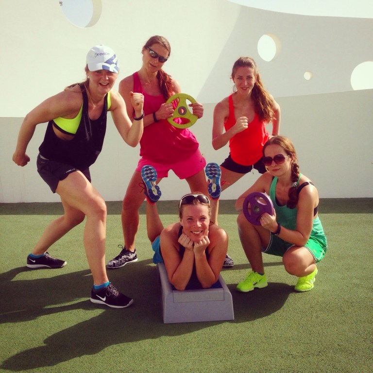 Tre dagar har passerat och igår var det lite lugnare, inte fullt så många pass eftersom det var föreläsning på eftermiddagen. Det är så kul att testa olika pass och igår var det dags för bodystep med en av tjejerna jag bor med här och det är inget jag är van vid direkt. Älskar dans och koreografier men är trög på att lära in det och ovan med steplåda. Galet jobbigt och kul, varmt och soligt hela dagen så efter träning och en stund vid poolen har jag också börjat jobba på brännan. Hade två dagar i skuggan som grund först.