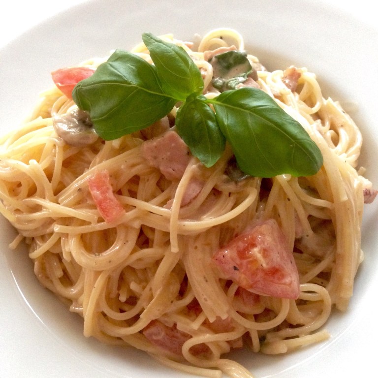 Jag är tillbaka till vardagen och igår lagade jag pasta till matlådor, som vanligt. Paradrätten spaghetti carbonara fick denna vecka en touch av tomat med chilisås och färska tomater och en bra upptäckt på affären: ekologisk kotlettbacon. Bra för samvetet och förhoppningsvis så bra för djur och natur som möjligt, även om vegetariskt förstås är bäst då. Nästan inget fett på heller vilket jag gillar (utan alltså), jag vill ha knaperstekt eller näst intill.