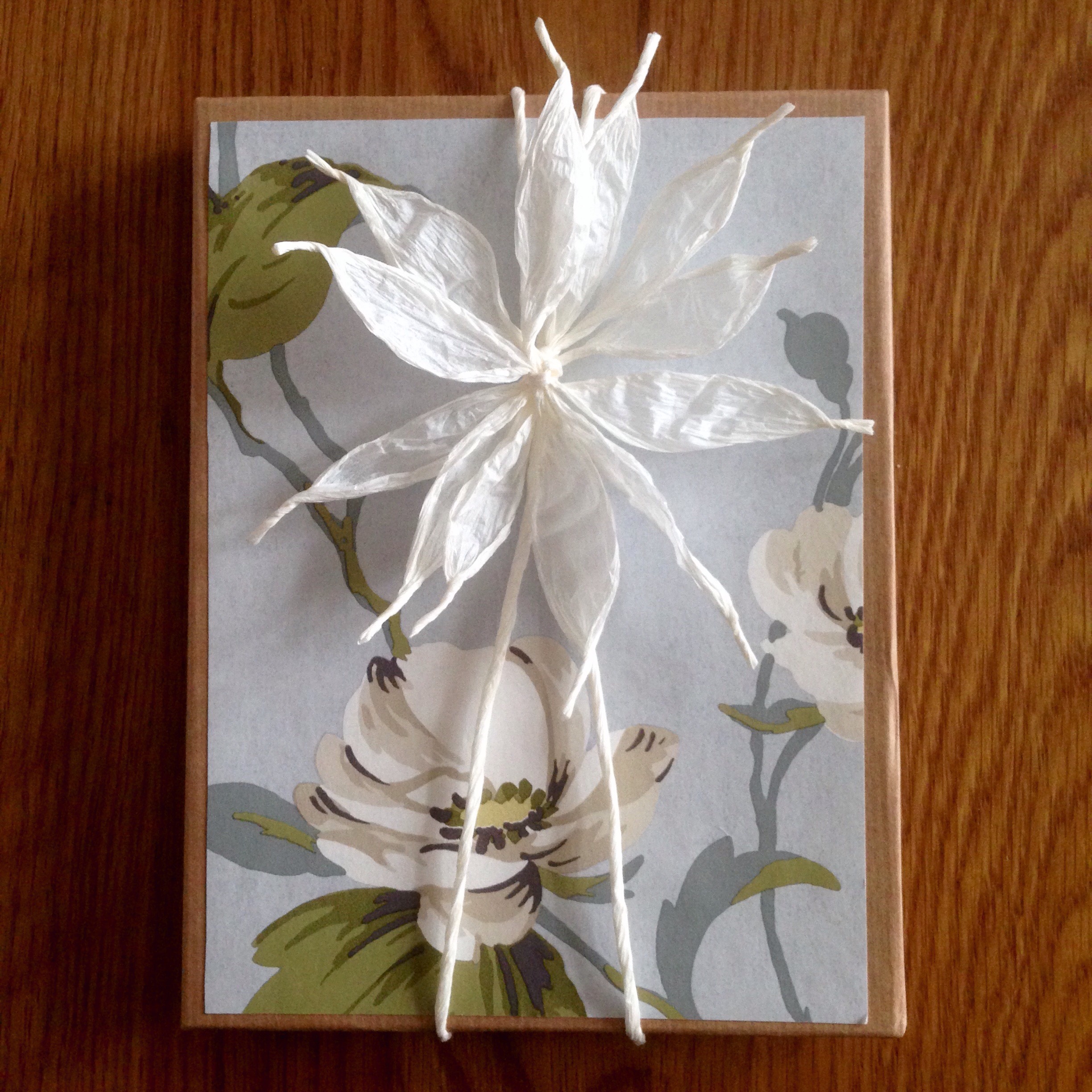 Älskar att slå in paket och göra kort när jag har tid göra det ordentligt, idag blev det en gammal ask för pennor som fick presentpapper och tapet på locket och en papperssnöreblomma, min specialité kan man nog säga.