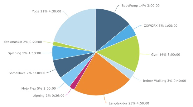 Det är fortfarande en stor andel yoga också och så vill jag fortsätta ha det. Även övrig konditionsträning har jag fått in, började redan i November att ta mig i kragen och indoor walking är nog det svettigaste och mest skidliknande som det går att komma, jag är inte tillräckligt vass på skidor för att köra intervallpass utan det passar bättre för mig att köra intervaller i stakmaskin eller gå på ett indoorwalkingpass, och utomhus samlar jag bara mil.