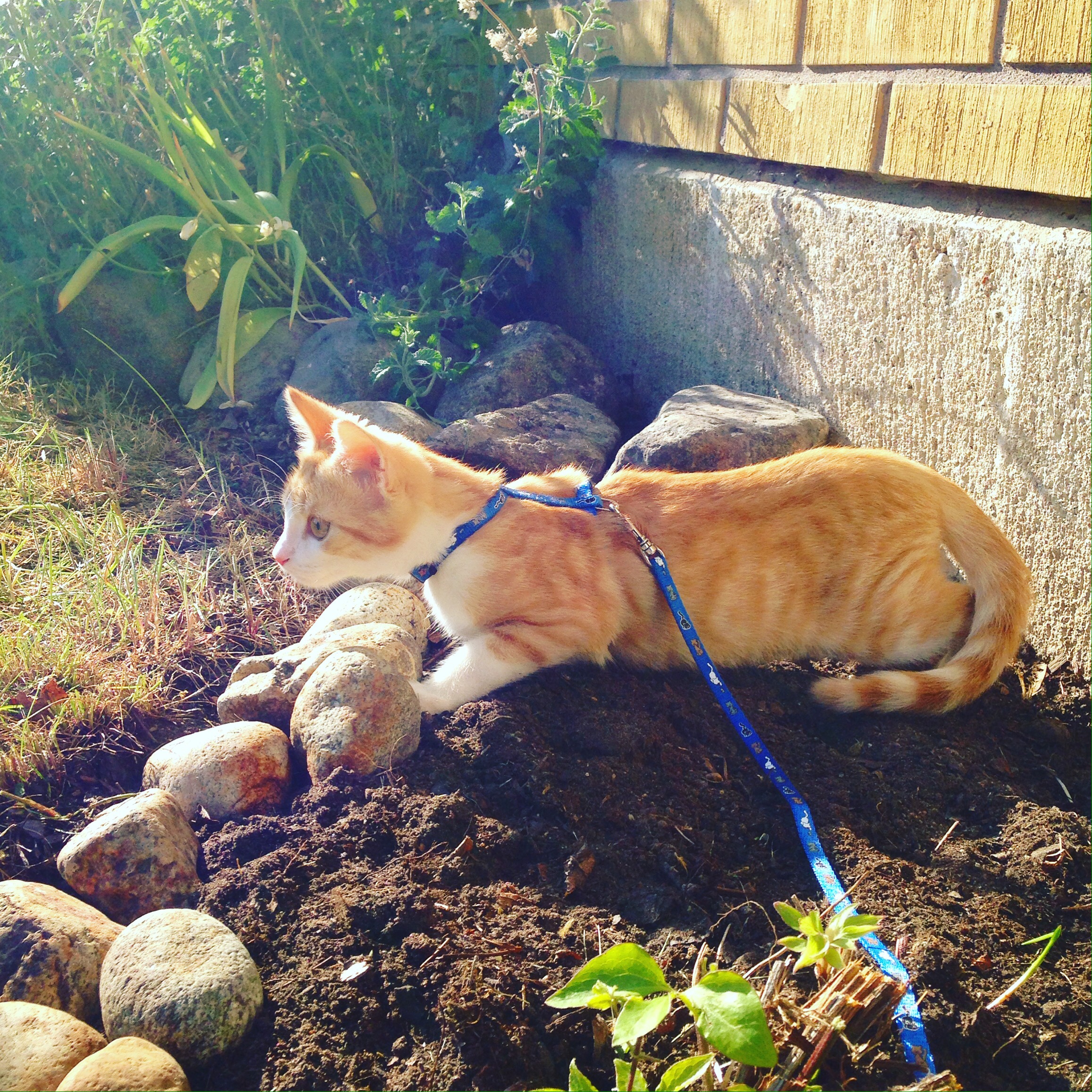 Idag har Charlie haft utepremiär. Jag fick en sele och ett band av en snäll kollega vars katt vuxit ur det och det var så fint väder att vi gick ut direkt efter middagen. Jag trodde han skulle hoppa och skutta och försöka smita ur selen men han ville mest sitta i mitt knä och smyga runt under buskarna nära husväggen… Inget vilddjur än så länge! (skönt!)