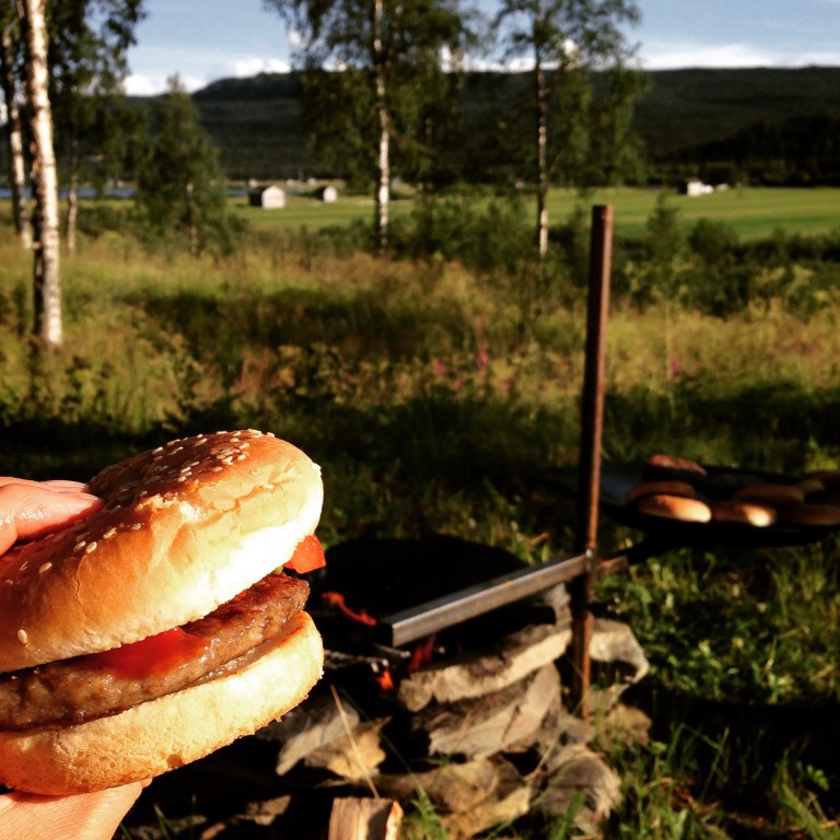 Att äta ute. Så enkelt och gott, ändå blir det inte av så ofta. Här i Ammarnäs blir det dock av oftare än på andra ställen för mig, av ganska naturliga skäl. Den här sommaren är inget undantag och igår (eller förrgår? Jag har semester) var fredagsmiddagen hamburgare med extra allt ute på muurikkan nedanför stugan.