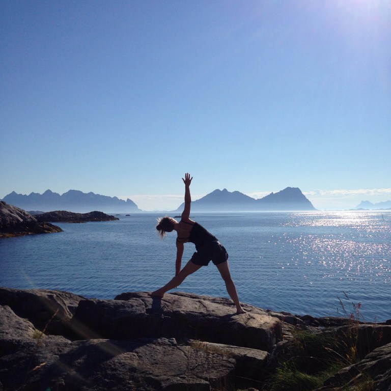 Jag älskar yoga utomhus, här i fjällen är inget undantag. Yogade utomhus i Italien vid Gardasjöns strand och i en park (med hundbajs…) i Venedig. Vid Kebnekaises fot mjukade jag upp en stel fjällvandringskropp med några solhälsningar utanför tältet och på Lofoten hittade jag en klippa som såg precis ut som en yogamatta.