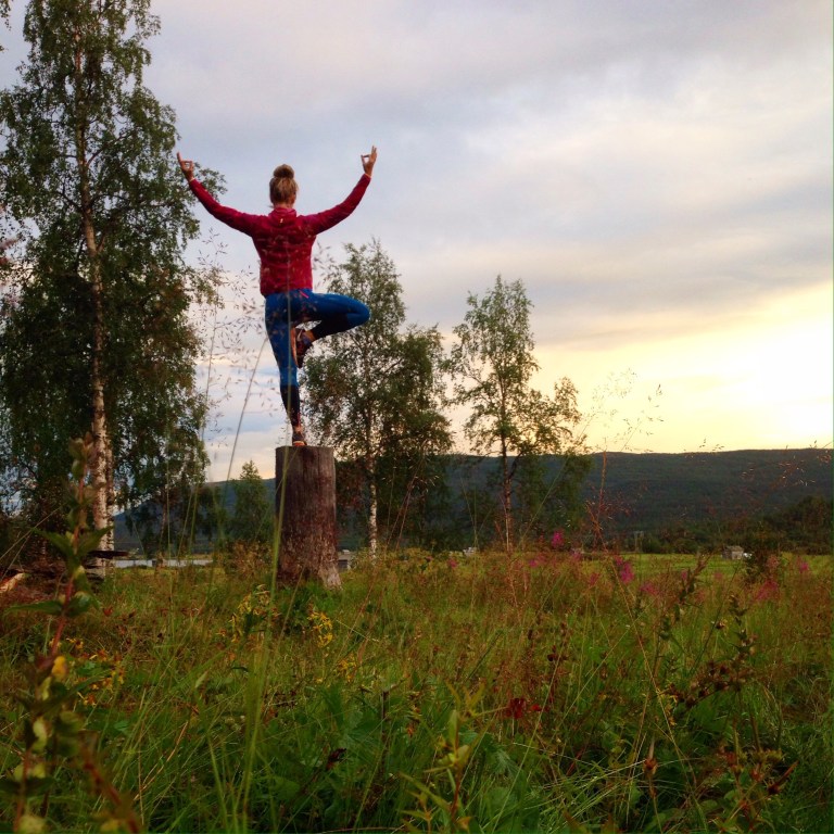 Positionen på översta bilden heter trädet och passar perfekt att stärka mina fotleder efter fjällvandring och inför mer fjällaktiviteter. Fantastisk för balansen, fokuset och bålkontrollen och går att variera i oändlighet. Den kommer vi med allra största sannolikhet praktisera i Hemavan till helgen!
