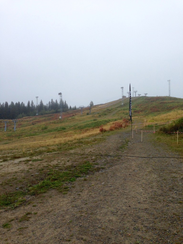 Uppvärmning stavgång uppför bräntis. Rätt upp i liftspåret bara, hela backen! Ett varv till i joggtempo så var vi varma. Redan där kände jag att skillnaden mellan power walk, jogg och fullt fräs var minimal för min del – det var urjobbigt. Jag hade ingen pulsklocka och det var synd för jag tror jag fick en ny maxpuls!
