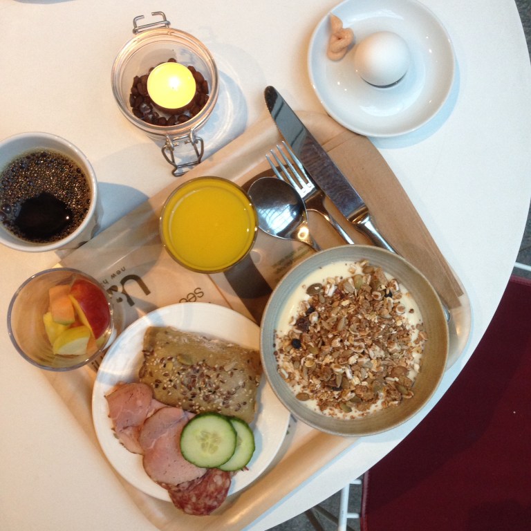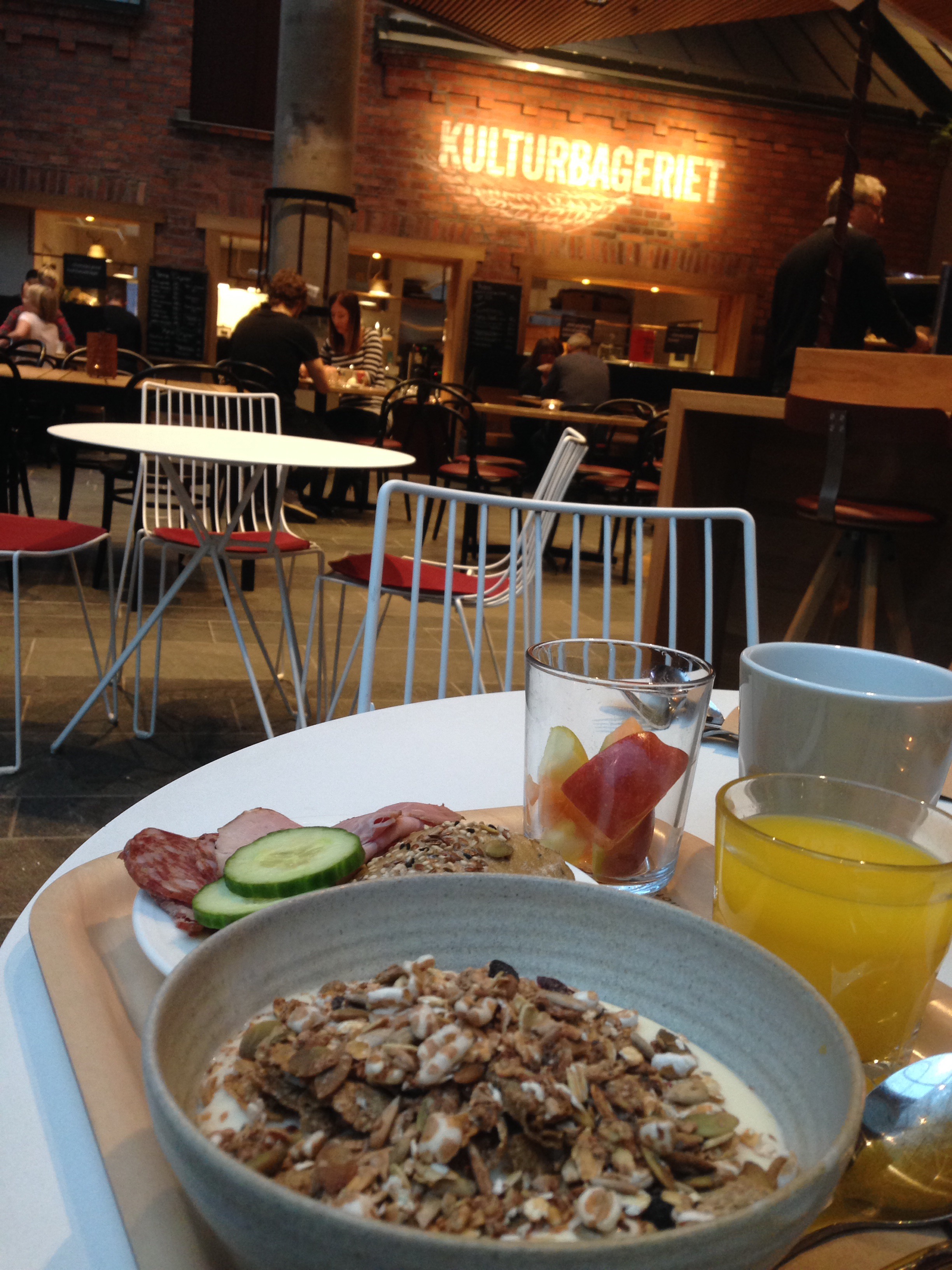 Boende på U&Me hotel äter frukost på Kulturbageriet och det går att äta där ändå, jag har haft frukostmöten där med Johanna på systrar i bergen flera gånger. Det är inte buffé utan det är lite som det kan vara på flygplatser, välj ett bröd, ta pålägg, välj en yoghurt, ta ägg och kaffe. Egentligen är det ju allt som behövs.