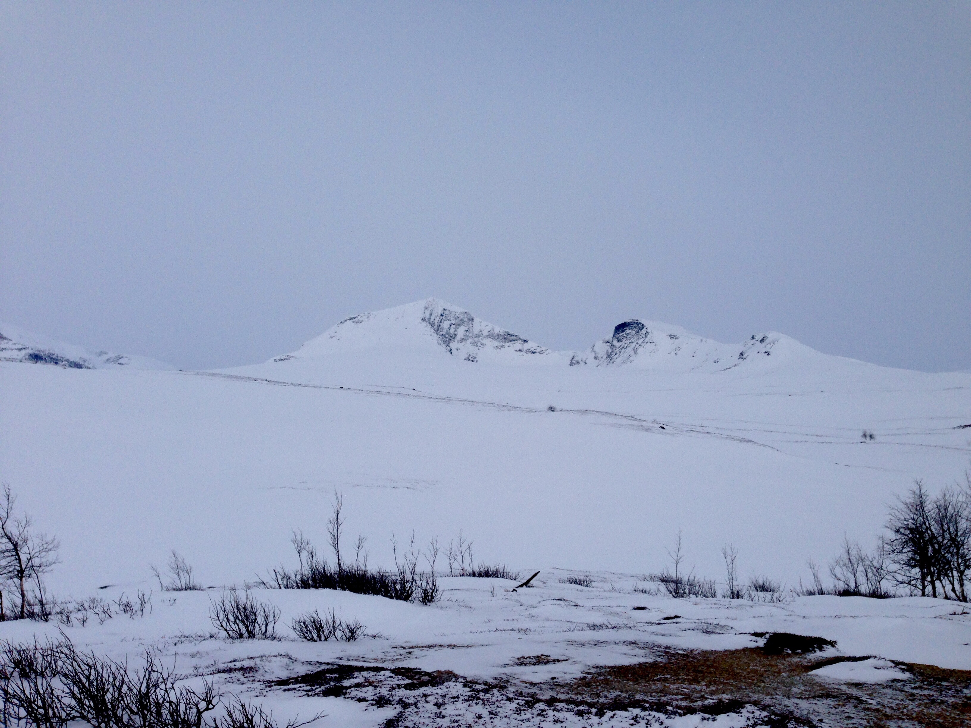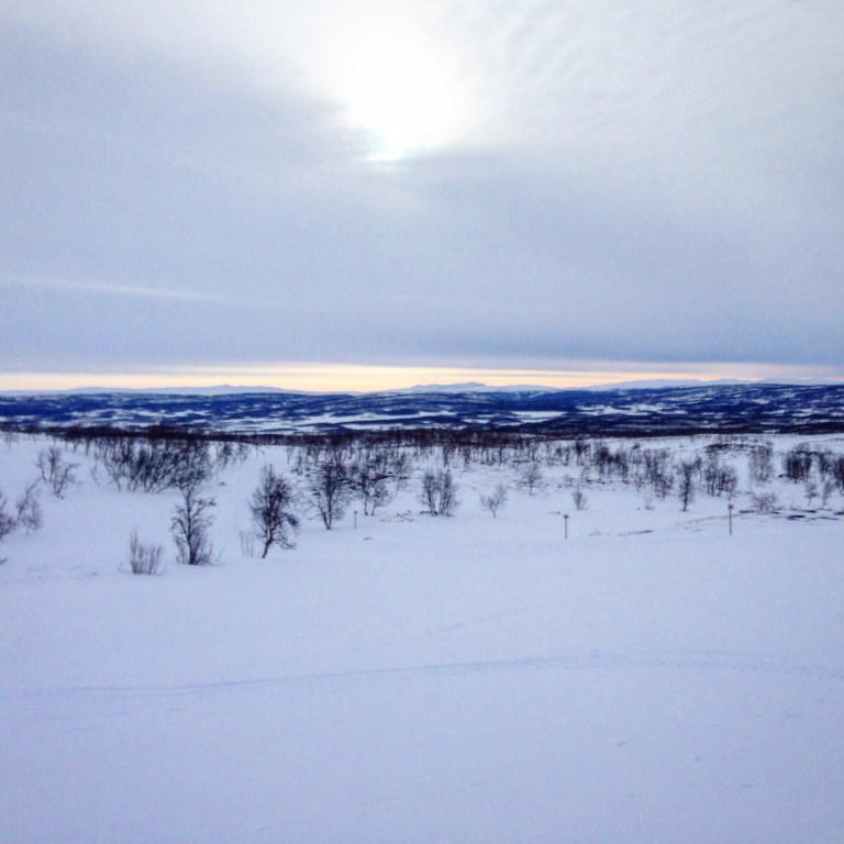 Efter näst sista laget passerat tog jag mig lite lunch från muurikkan och snörde sen på mig mina egna skidor och satte av utför ner mot Tärnasjön. Ljuvligt före! Ingen sikt men med fräscha ben som bara varit uppe länge men inte åkt uppför slalombacke och viterskal så var det perfekt mjuk snö. Jag tog knappt i och väl nere på Tärnasjön var det lugnt och vindstilla. Jag har alltid trott att det skulle blåsa där, det kan det nog också göra, och att den skulle kännas sjukt lång men det var bara att ta käpp efter käpp och inte trampa på för hårt för det var rätt isigt under nysnön så det blev en kombination av stakning och fyrans växel i litet format och det gick så lätt så lätt. Efter Tärnasjöstugorna dröjde det inte så många kilometrar förrän skotrarna kom ikapp mig med det sista laget som bestämt sig för att ta skotern tillbaka, de hade energi kvar men insåg att den inte skulle räcka hela vägen till mål så de ska ha stor cred att de tog sig så långt ändå! 3 mil på fjället är inte fy skam, det är de som åker hela 8 mil som gör en enorm insats. Jag hade också mycket energi kvar men det började snöa mer och mer och det vore dumt att stanna ute när alla skotrar åkte iväg. Så in i pulkan jag också.