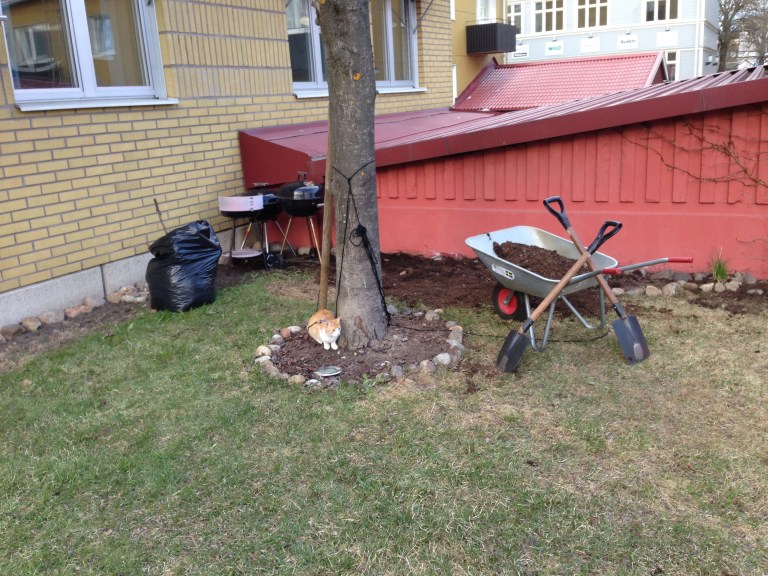 Jag fick slutligen även tummen ur och bytte till sommardäck på cykeln och började skruva på alla tillbehör som inte satt på, biltema säljer ju mer som cykelskelett och resten får man fixa själv. Stödet gick bra sånär som på att det sitter löst men resten var katastrof. Stänkskärmarna är på plats men sitter inte stadigt, det saknas en skruv (jag är HELT säker, det är inte jag), cykelkorgen passar inte och pakethållaren visar inga tecken på att passa den heller. Kedjeskyddet har jag gett upp på förhand. Varför köpte jag inte en där allt ingick? Charlie hade iallafall en härlig stund ute på gräsmattan medan jag pysslade på. Han tog sitt första byte faktiskt, en humla. Inte supersmart men är man nybörjare så är man. Inte alls lika dramatiskt som för tjuren Ferdinand dock och det stöder min tes att det är inte en humla han sätter sig på, det är ju en geting. Charlie – humlan 1-1.