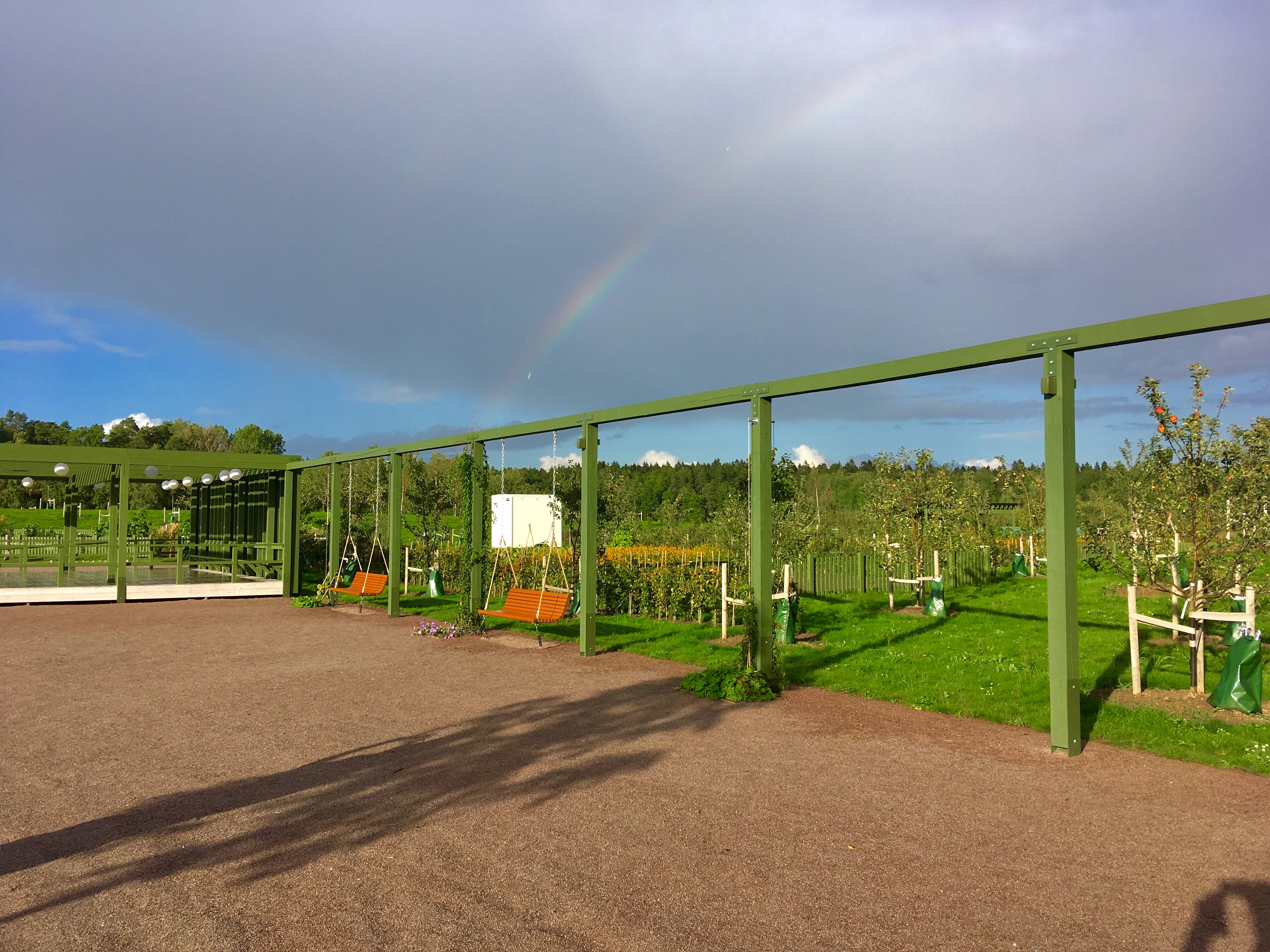 Så fin utemiljö, ligger en liten plätt alldeles intill bostadsområdet och ett barnstenkast från förskolan med ute-tema. ”Paradiset” är det döpt till, fint med möjlighet att odla! Ser ni regnbågen?