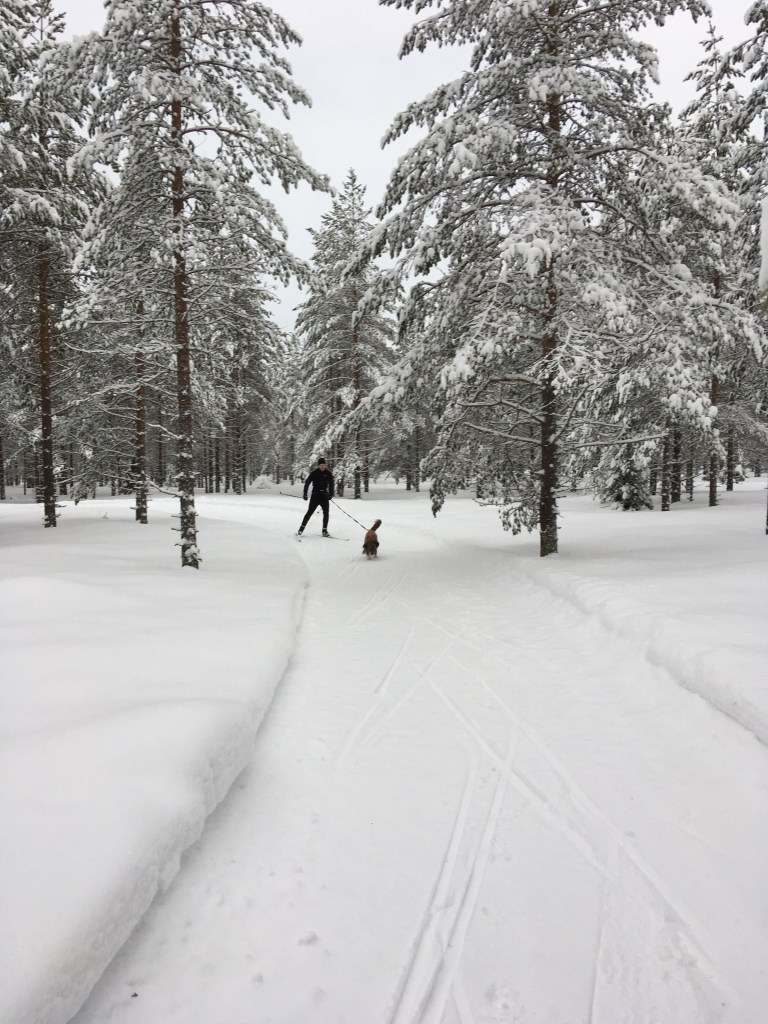 Jag har haft en fin kalashelg full av vinter, vänner och mat. Jag tog kompledigt i fredags för vi har bara halvdag då och det är ju alltid trevligt att få vara ledig på sin födelsedag. Macke och Nova hämtade upp mig efter frukost och så testade vi spåret vid Piparböle för första gången. Riktigt fint, kurvigt och flackt och inlindat i en sagoskog. Dit kommer vi åka igen! Det är ett spår specifikt för att skejta med hund så det passade oss bra.