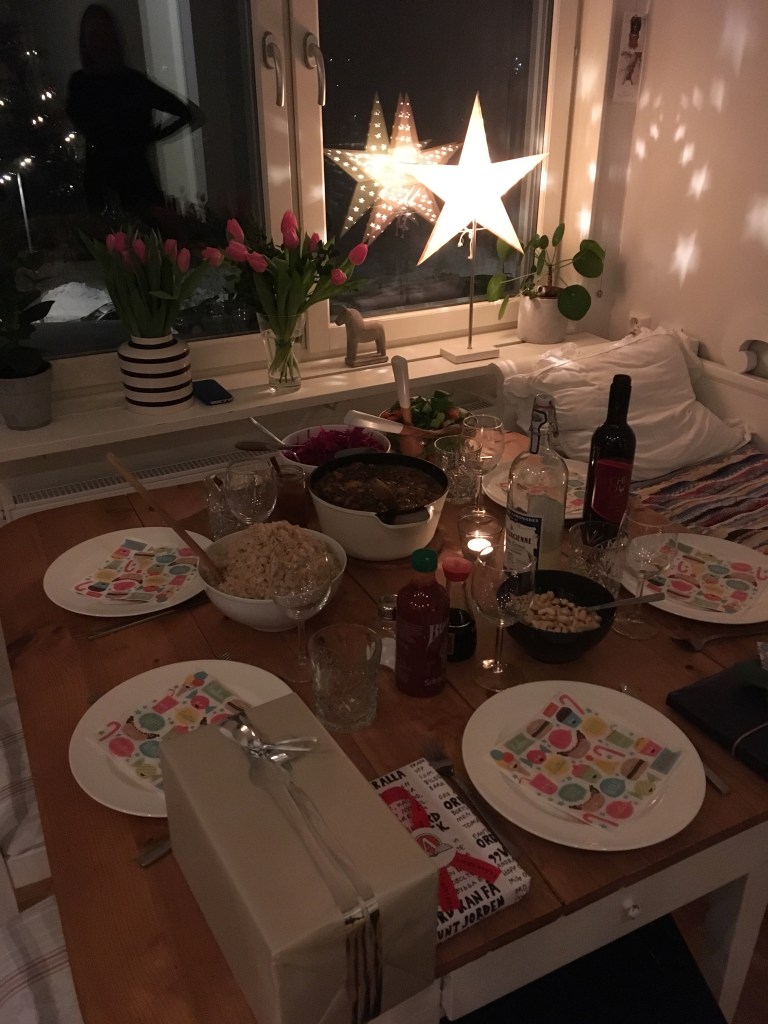 Sean var det dags att svida om igen för då kom vännerna på besök och vi lagade mat ihop, en vegansk gryta med belugalinser och sötpotatis. Galet smarrigt och trots att vi blev proppmätta gick andra halvan av kladdkakan ner i magarna. Supertrevligt!