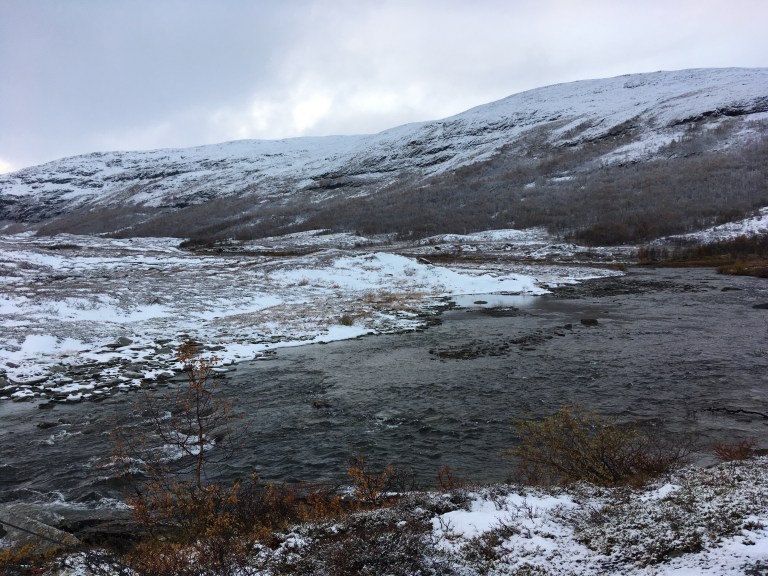 Första dagen när vi kom med tåget var det höst och lite puder på topparna, vi sov på vandrarhemmet och måndagen var bara föreläsningar. Det var rejäl blåst och snöade så det var lite pirrigt hur vädret skulle bli, men vi fick så himla tur med det så det hade inte kunnat bli bättre. Det är ju ändå en kurs och ett bra tillfälle att ha det lite motigt, men såklart är det mer gött att få vara torr och varm. Hellre några minusgrader än just över nollan, så håller det sig torrare. Och man får se snö!