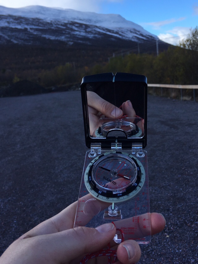 Min nya kompass som jag nervöst köpt för att ha rätt sort gick i tusen beståndsdelar första gången jag tog fram den tyvärr, så jag fick låna en av en av våra lärare tack och lov. Helt nytt det här med syftningskompass, att använda en spegel med streck i för att kunna se mer precist vart siktet är. Jag är inte ens van att använda vanlig kompass så jag både gruvade och längtade till att få lära mig mer. Kartor älskar jag och orientera är kul och jag har ju nördat in mig rejält på det i sommar också runt Ammarnäs, dock utan kompass.