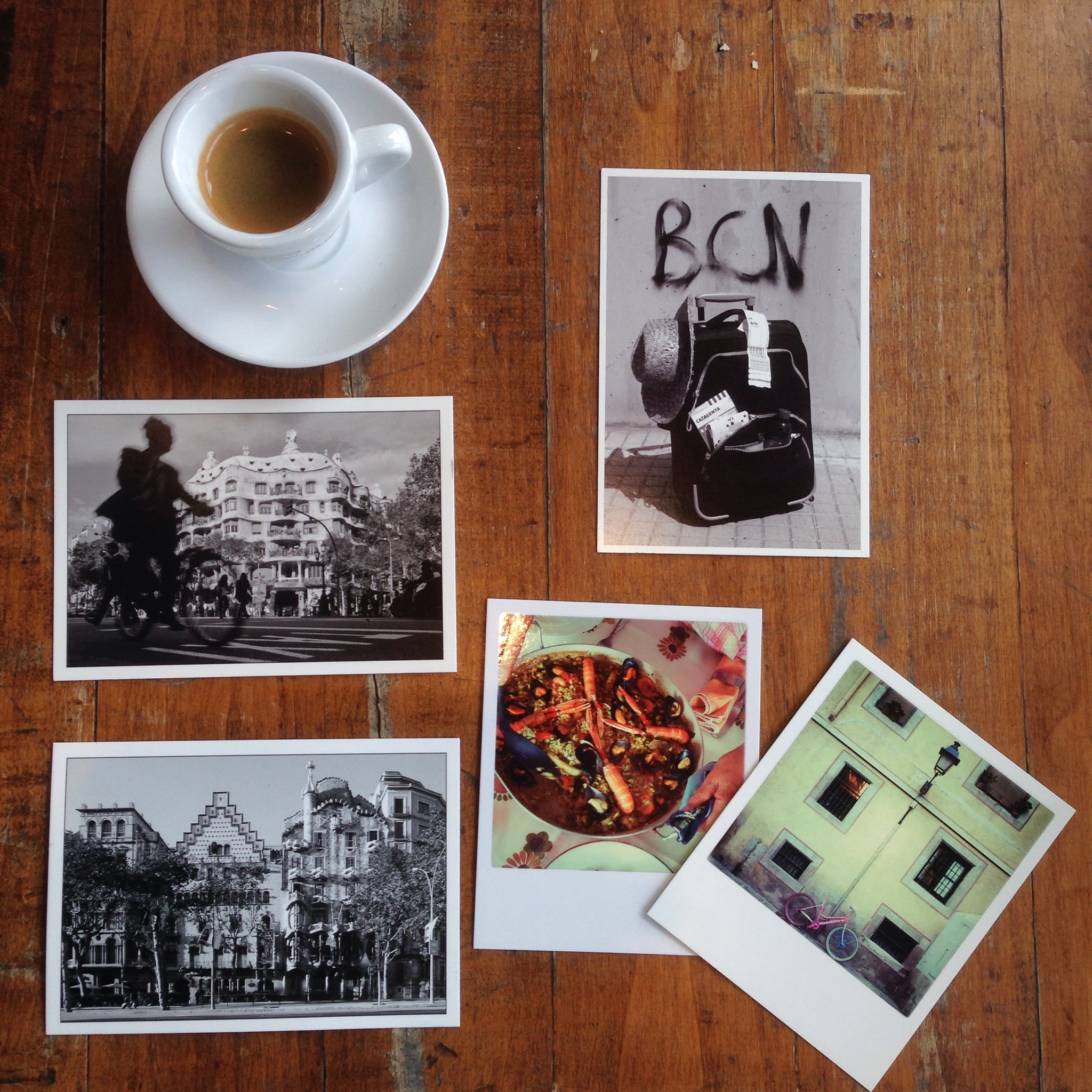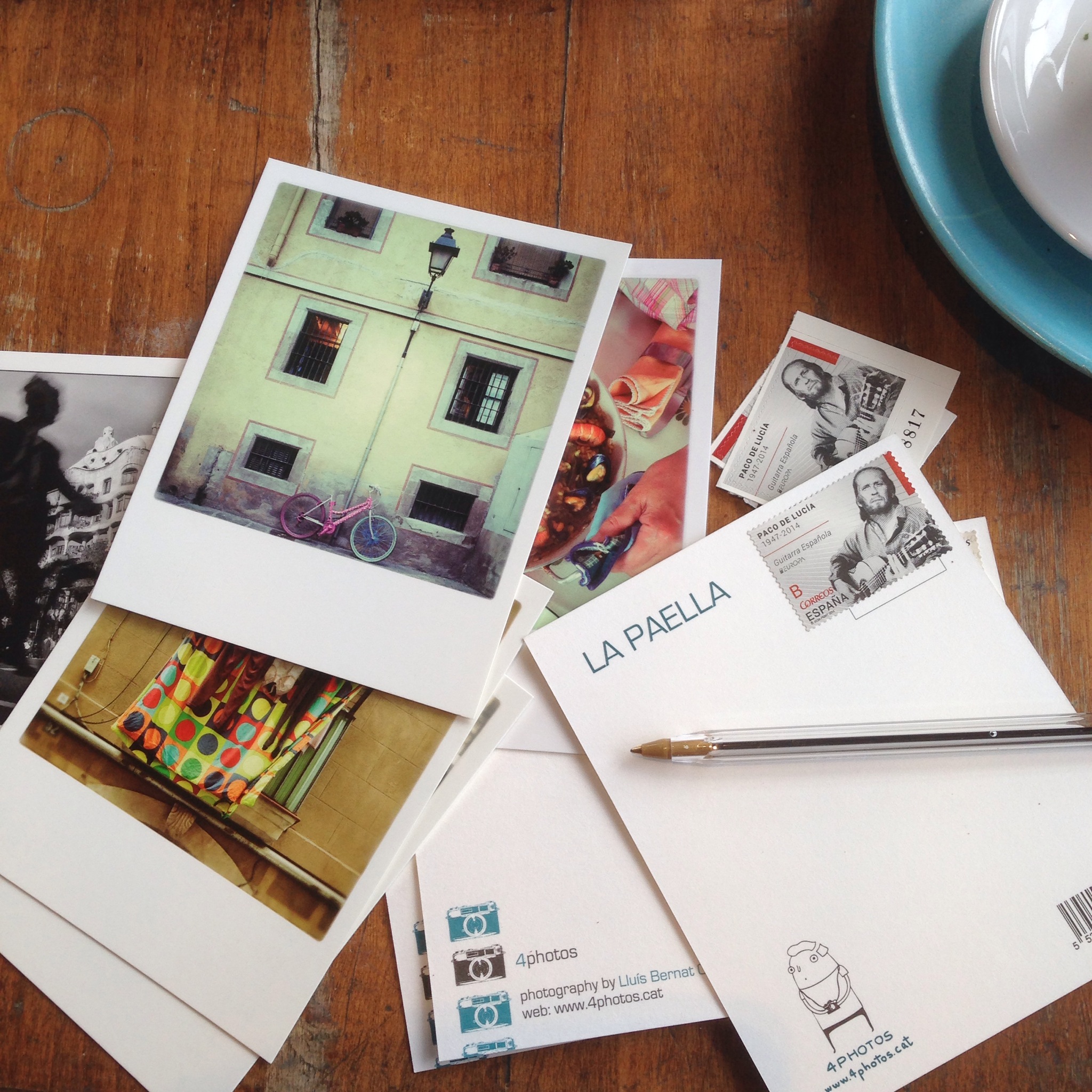 Jag älskar vykort! Trots att det finns så många kanaler att skicka hälsningar digitalt så är det något särskilt med vykort. Jag älskar att skriva dem så det känns inte alls som något måste. Nog har det hänt att de rafsats ihop med stora bokstäver i all hast, till och med på Arlanda på väg hem… Men allra helst vill jag sitta på ett café i lugn och ro och skriva personligt. Idag sitter jag på Buenas Migas i Barceloneta, precis nere vid stranden där linbanan har sitt stopp. Det är mitt favoritcafé och här har jag suttit oändligt många gånger själv och med Erika, hit tog jag nästan alla som hälsade på när jag bodde här och det var hit jag och Adriana gick min allra första dag och jag lärde mig skillnaden på att beställa pasta med polla/pollo. Pasta med snopp fanns inte på menyn så det fick bli med kyckling istället.