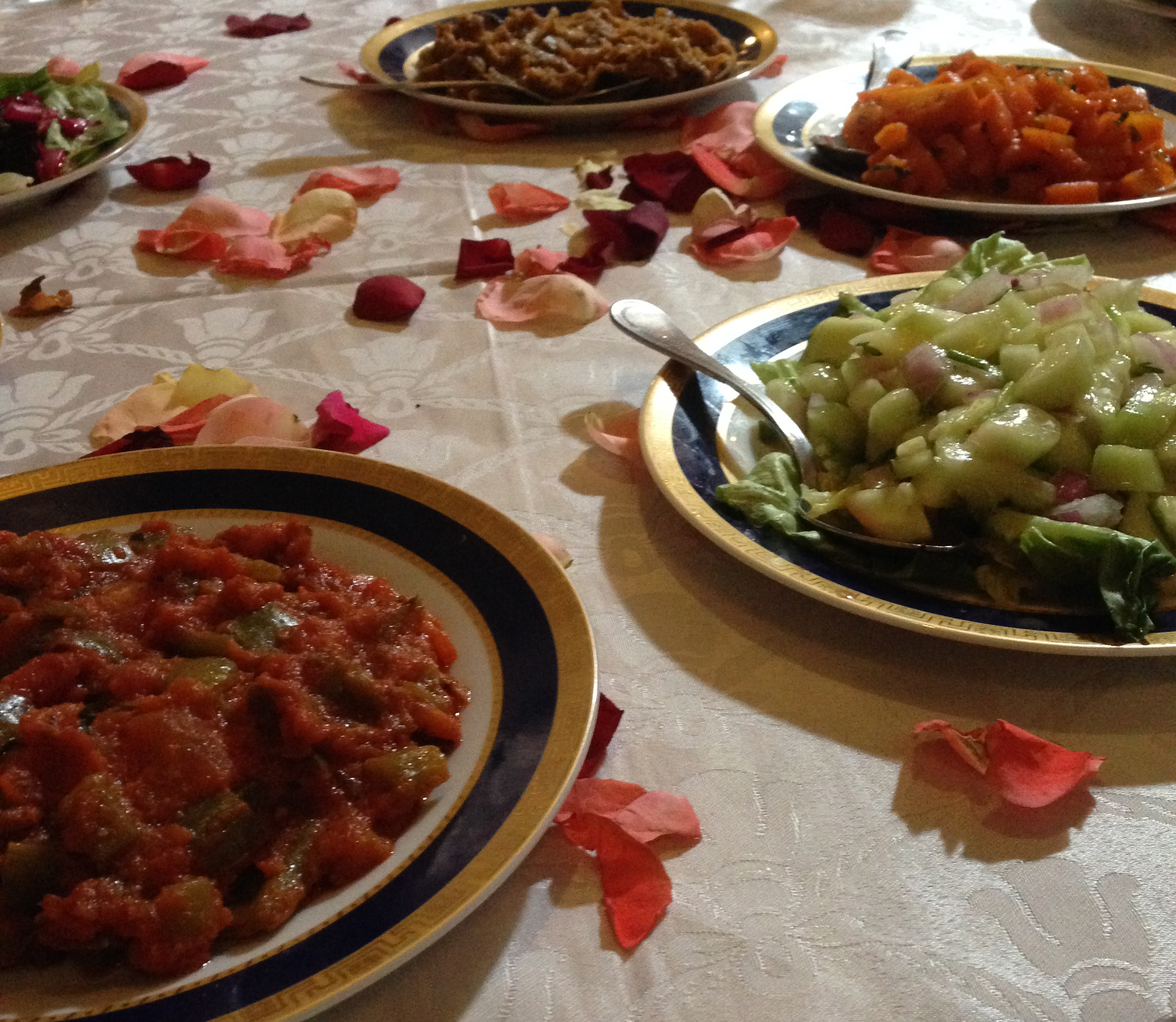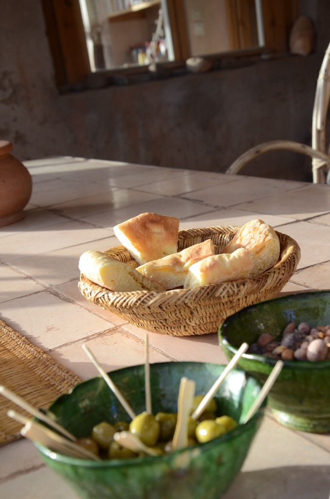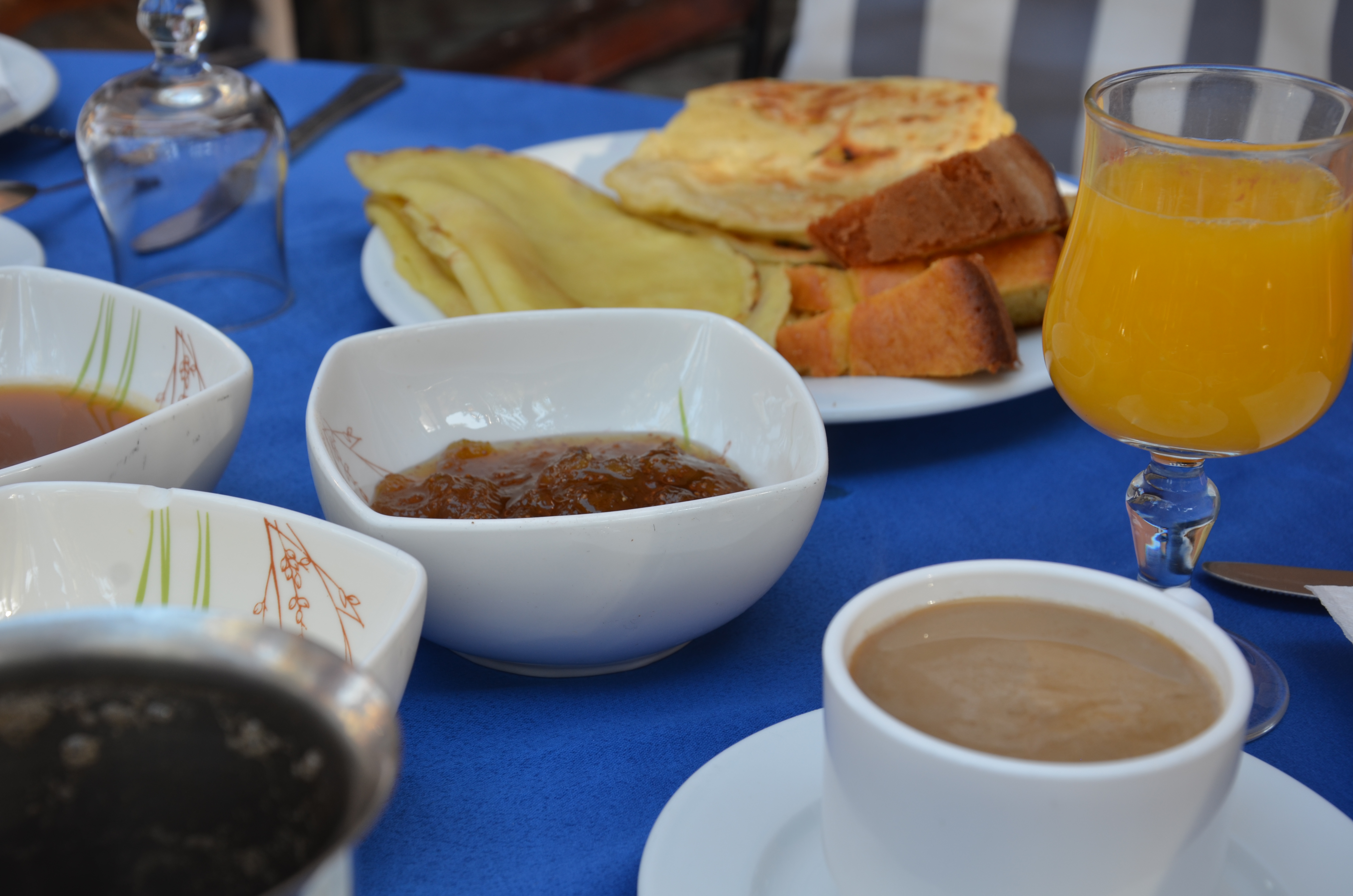I stort sett alla rätter tillagas i Tagine i Marocko. En konformad lergryta som gör att maten blir ångkokade och får fantastisk smak. Grytor med kyckling, couscous, potatis, grönsaker och annat gott under locket. Många små rätter är också populärt, syrade grönsaker, röror och sallader, helt andra smaker än vad vi är vana vid i svensk kost. En blandning av afrikansk och arabisk mat skulle jag vilja säga, utifrån egen erfarenhet utan att vara särskilt påläst på världsköken. Frukosten är kaffe, juice, bröd och sylt.