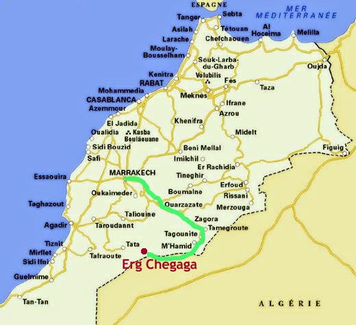 Första kvällen spenderades i M’Hamid och jag checkades in med Towe som gjort den här finfina kartan över vår rutt. Vi inkvarterades, åt middag och stupade i säng för att vakna tidigt av fågelkvitter som får vilken wake up-light som helst att skämmas och en frukost med färskpressad apelsinjuice som jag kommer minnas i minst hundra år.
