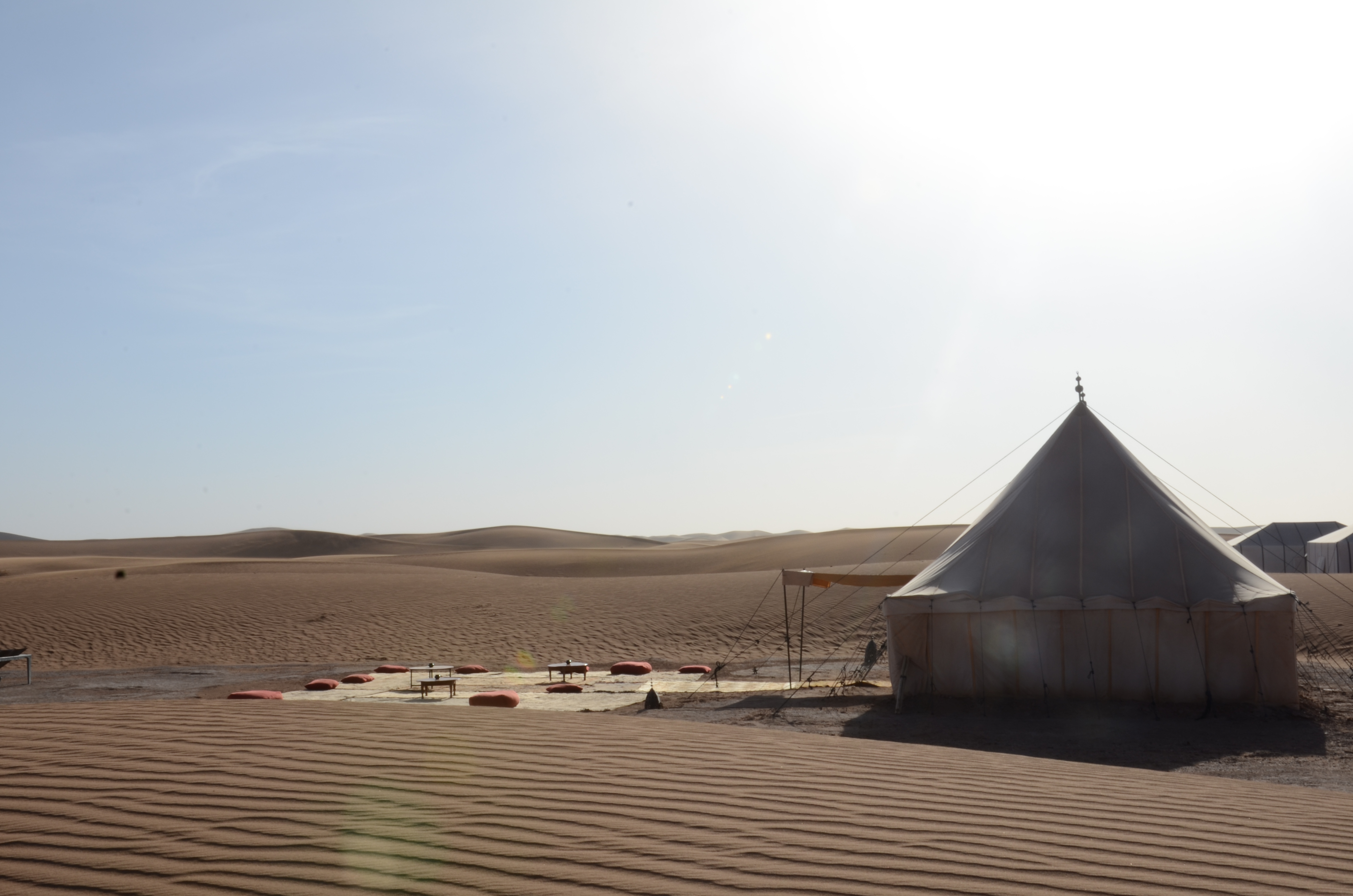 Efter två timmars körning efter att vägen slutat kom vi fram till vårt lyxiga desert camp i Erg Chegaga. Tälten var inga vanliga tält som sagt, utan stora och verkligen oväntat lyxiga. Gjuten platta!