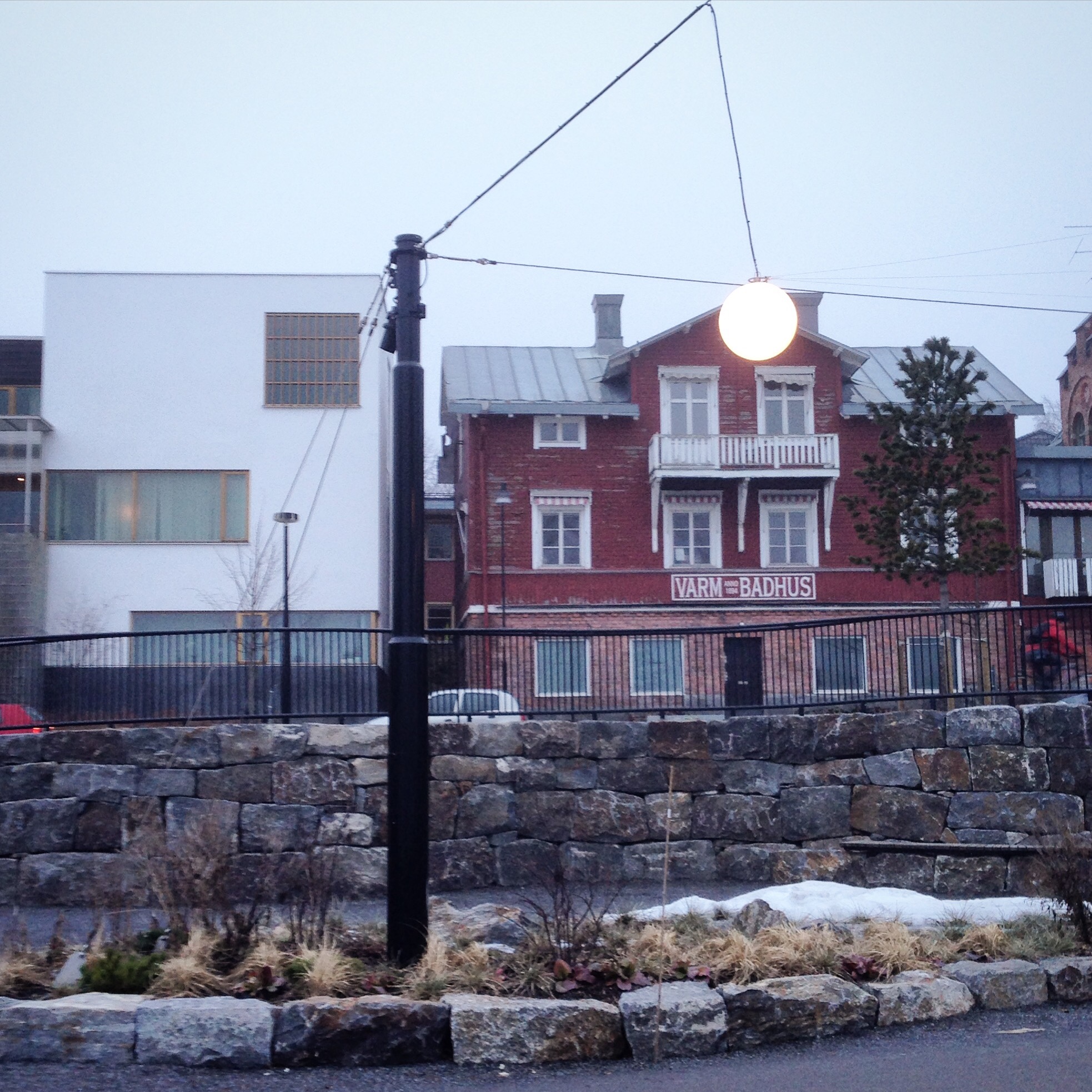 På ungefär samma ställe syns även dessa två hus, Umeås äldsta kallbadhus och bostadshuset åt Umeås meste finansman och fastighetsägare i modern tid: Krister Olsson. Han kan ta åt sig ära och förskräckelse för ganska mycket längs strandpromenaden och tycka vad man vill, men bidragit det har han verkligen! Själv fascineras jag av kontrasterna och tycker att allt har sin tid och sin charm och sin historia. Jag är lite nördig på just strandpromenaden, skrev min c-uppsats i arkitektur om den för numera rätt längesen (2008) och projektet ”Staden mellan broarna” som inleddes 1989 börjar faktiskt bli färdigt. Åtminstone färdigbyggt, nu ska vi umebor bara leva där också, och det bästa med det hela är att det gör vi! Umeås strandpromenad har blivit en sån där som andra städer har, där det flaneras, äts glass, joggas, cyklas, dricks öl, pussas, kramas, leks, tränas, skejtas, spelas musik. Jag gillar det skarpt!