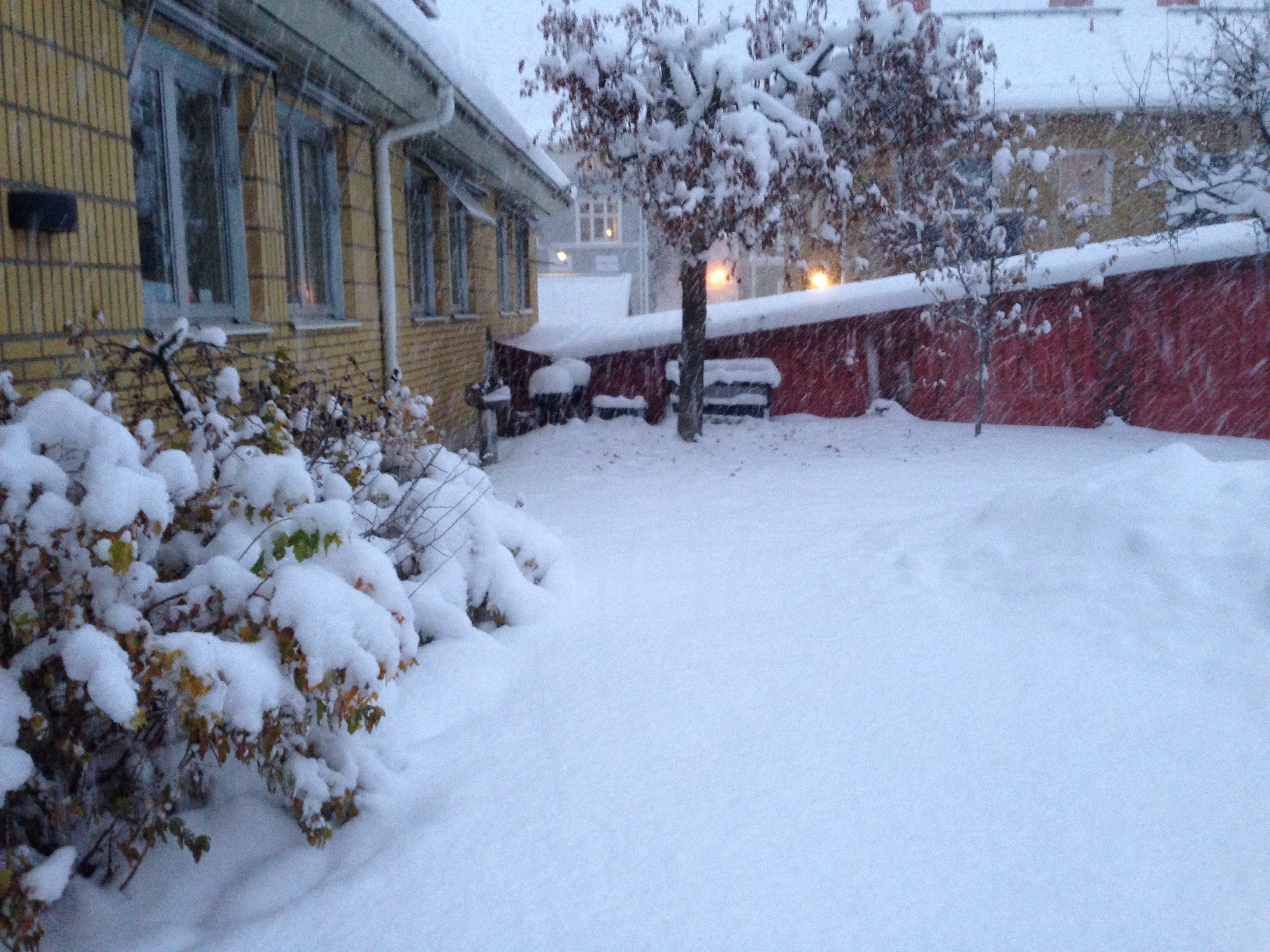 Nånstans där under buskarna sitter han jag tänkte leka i snön med. Som det snöat!