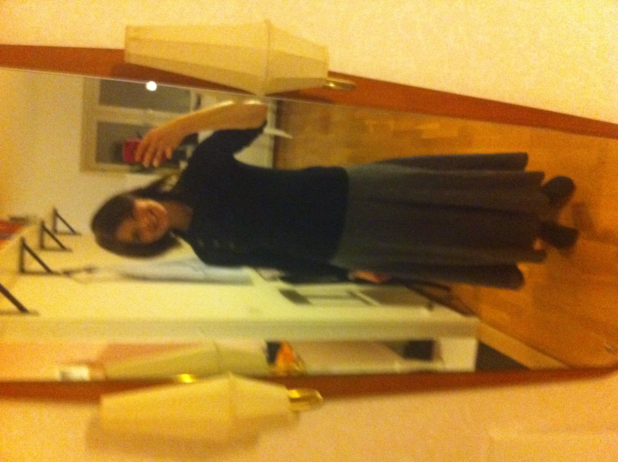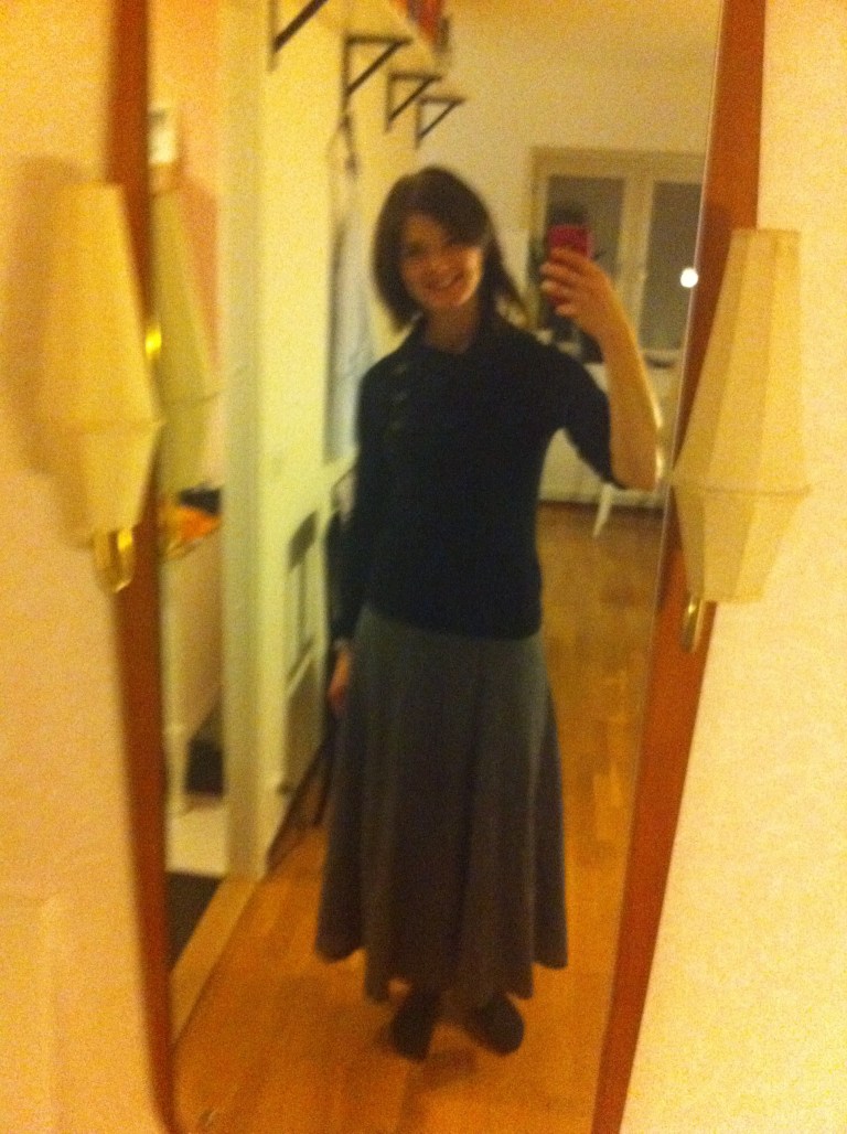 Men tänk, nu var det löning och alltså 25 klänningar. Som synes har jag kjol idag, denna som egentligen är svartvitrandig men den ser grå ut är från el rastro i somras…