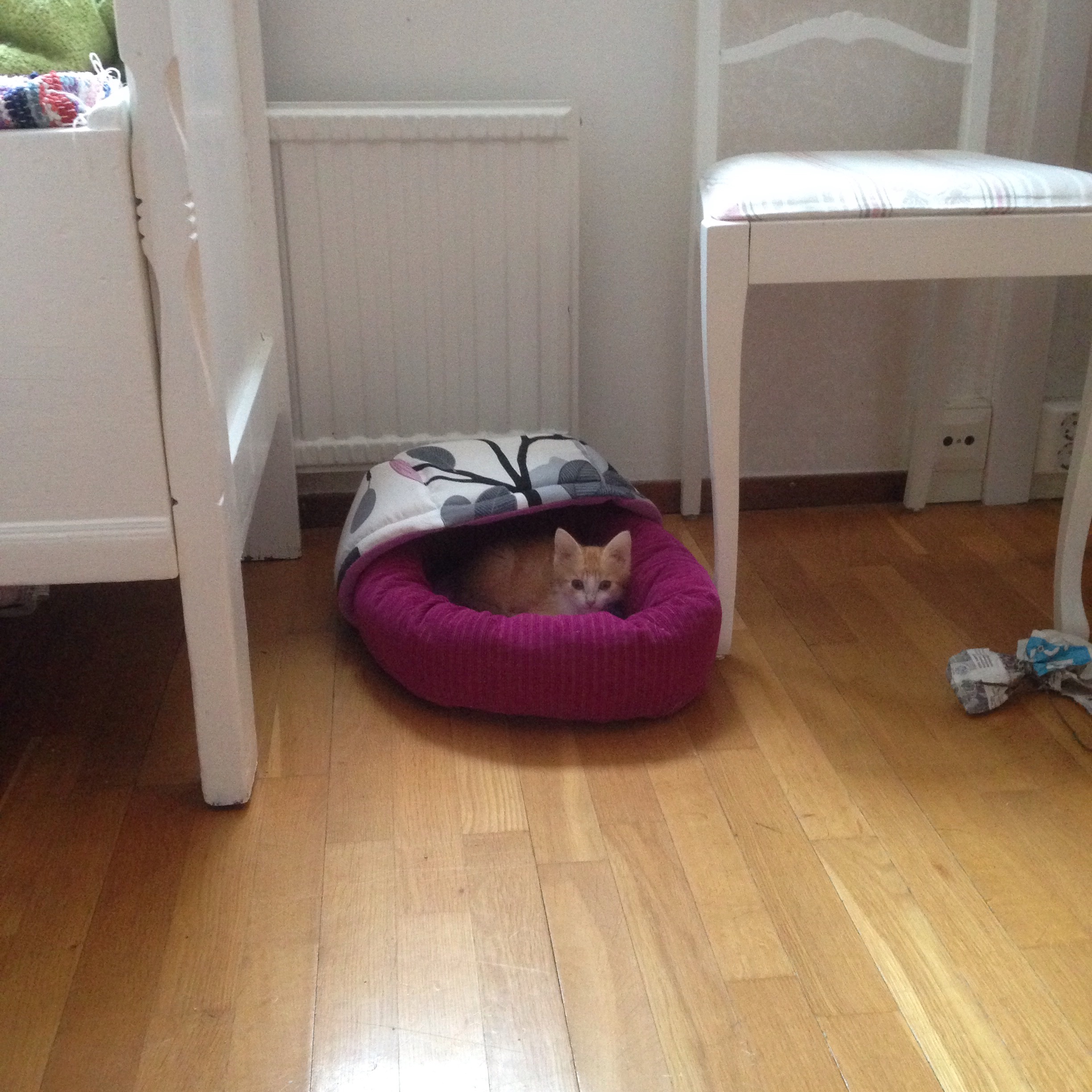 Men ganska snabbt hittade han sitt favoritställe och sin favoritfilt och nu ligger han där och sussar medan jag stökar på med disk, yoga och lite bloggande.