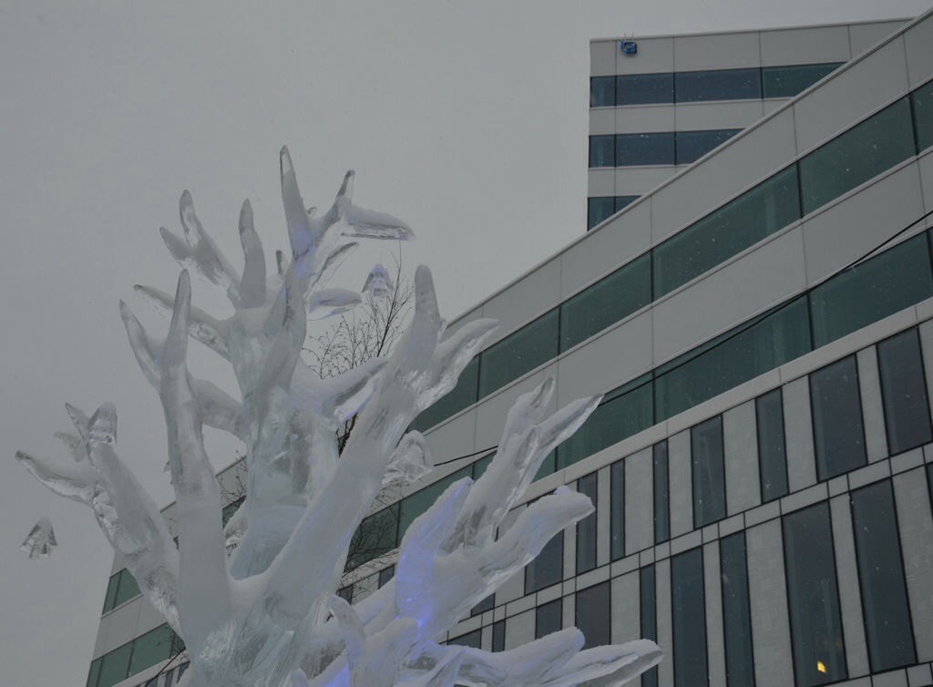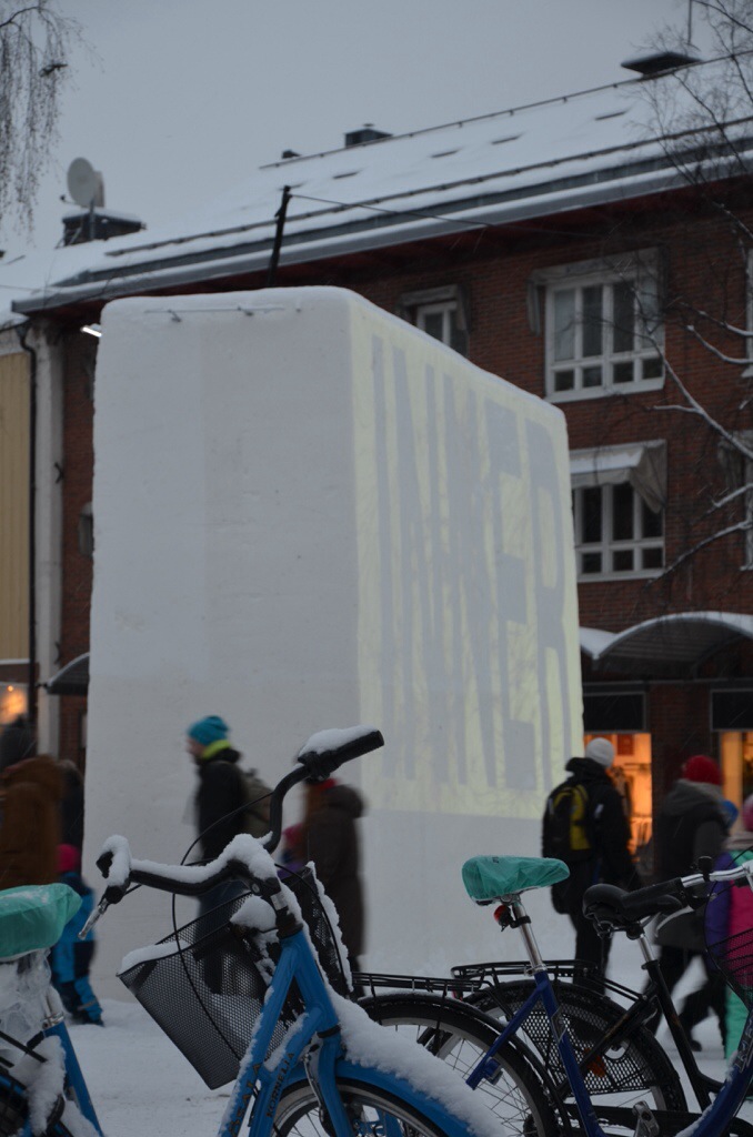 Ett vanligt tips brukar vara att inte försöka få med allt, att fota detaljer och händelser och inte vara rädd att utesluta. Den här bilden tycker jag är ett bra exempel på både och. Den är rörig och den visar så många aktiviteter att vid första anblick går det inte att urskilja någon särskild. Men tittar jag närmare ser jag att det här speglar Umeå för mig, på väldigt många sätt. Det är en vinterstad, jag ser Kii som är en unik butik, det ligger i hörnet där schmäck låg, caféet som vi numera minns i ett rosa skimmer och som aldrig kommer kunna ersättas av café latte-kedjor. I bakgrunden skymtar en byggkran som visar Umeå centrums senaste års byggfas. Mycket har byggts inför kulturhuvudstadsåret, och på bilden syns även ett av de konstverk som skapades just för invigningshelgen. Det omtalade konstverket om genusdebatten, som känns lite extra starkt i en stad med starka kvinnor som går i bräschen. Och till exempel startar schmäck, Kii, spelar trummor på invigningsceremonin eller kommenterar densamma i TV-sändningen. Till höger ser vi också Sagateatern, den gamla vackra lokalen där jag nyss sett klungan för kanske sista gången. Och där jag ska se Lisa Miskovsky, ännu en av de starka kvinnorna på Umeås scen, spela med sin syster Carolina i maj. Om några år kan Sagateatern vara ett minne blott, sparat i samma ask som Schmäck och apberget. Mitt i bilden går också Umeåbor, med sina plastpåsar från snabbköpen, i en vardag som fortsätter oavsett om det är kulturhuvudstadsår eller inte.