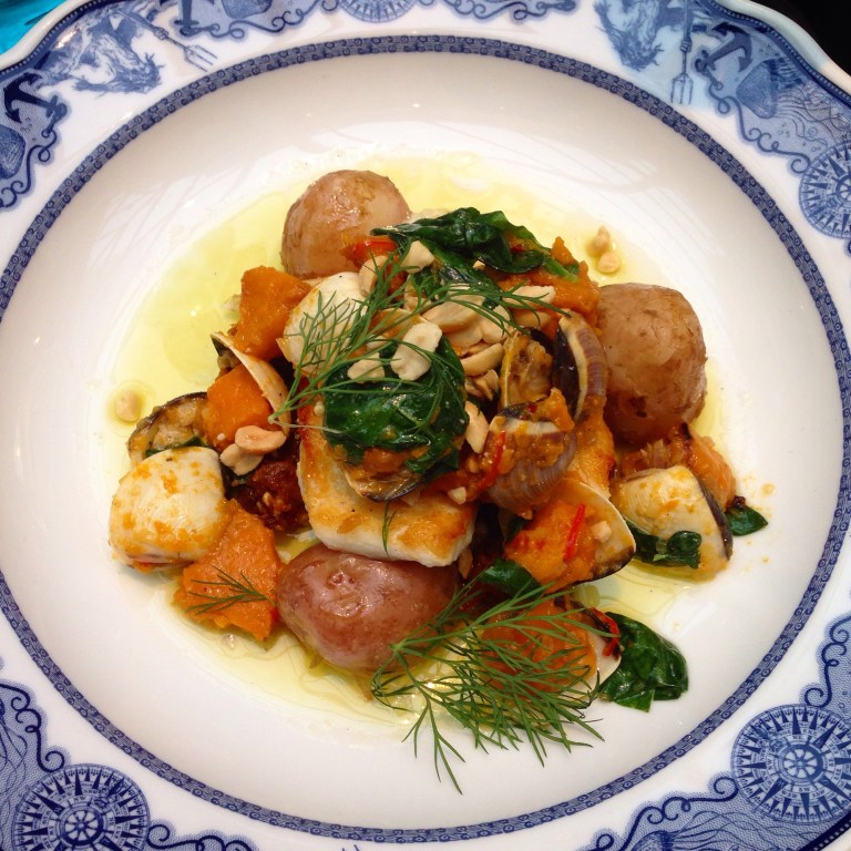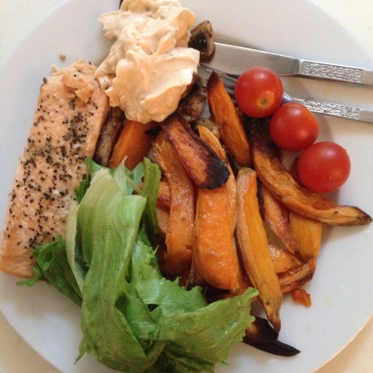 Efter en vecka av god fisk av olika slag var jag långt ifrån less utan tvärtom kändes det helt naturligt att steka lax till alla godsaker. Färskpären, morötter, lök…. Champinjonerna har vi tyvärr inte varken odlat eller plockat själv (var växer de?! Skulle till och med få ut mig på svampjakt!). Det ni ser i mitten är årets nyhet: polkabetor. Ser ut som rädisor på utsidan men är sötare än rovor! Mums verkligen.