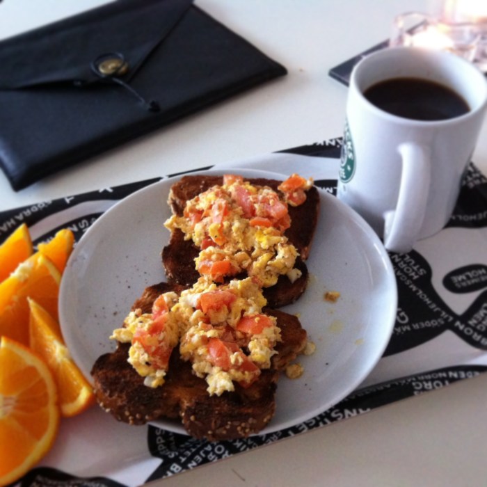 På grund av detta har jag börjat ställa klockan fast utan alarm även på helgerna för att se hur mycket jag sover över tid. Inatt sov jag exakt på minuten lika länge som förra fredag-lördagnatt. 9 timmar och 17 minuter. Måste vara min optimala fredagssömn. Deja vú och en kopp kaffe på det och såklart extra god frukost. Ägg-hackad tomat-&-vitlök-röra på rostade mackor. Och så en ocean av helgtid framför.