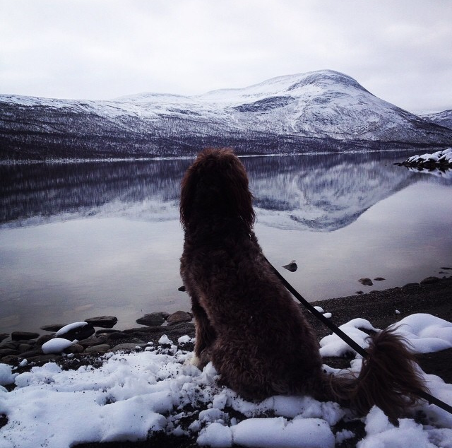 Idag har det snöat!! Medan jag satt på möte föll stora flingor utanför fönstret, men ingenting ligger kvar. Bilden är lånad av brorsans sambo, de var i Ammarnäs i helgen. Ett spegelblankt Tjulträsk och världens mest vattenälskande hund.