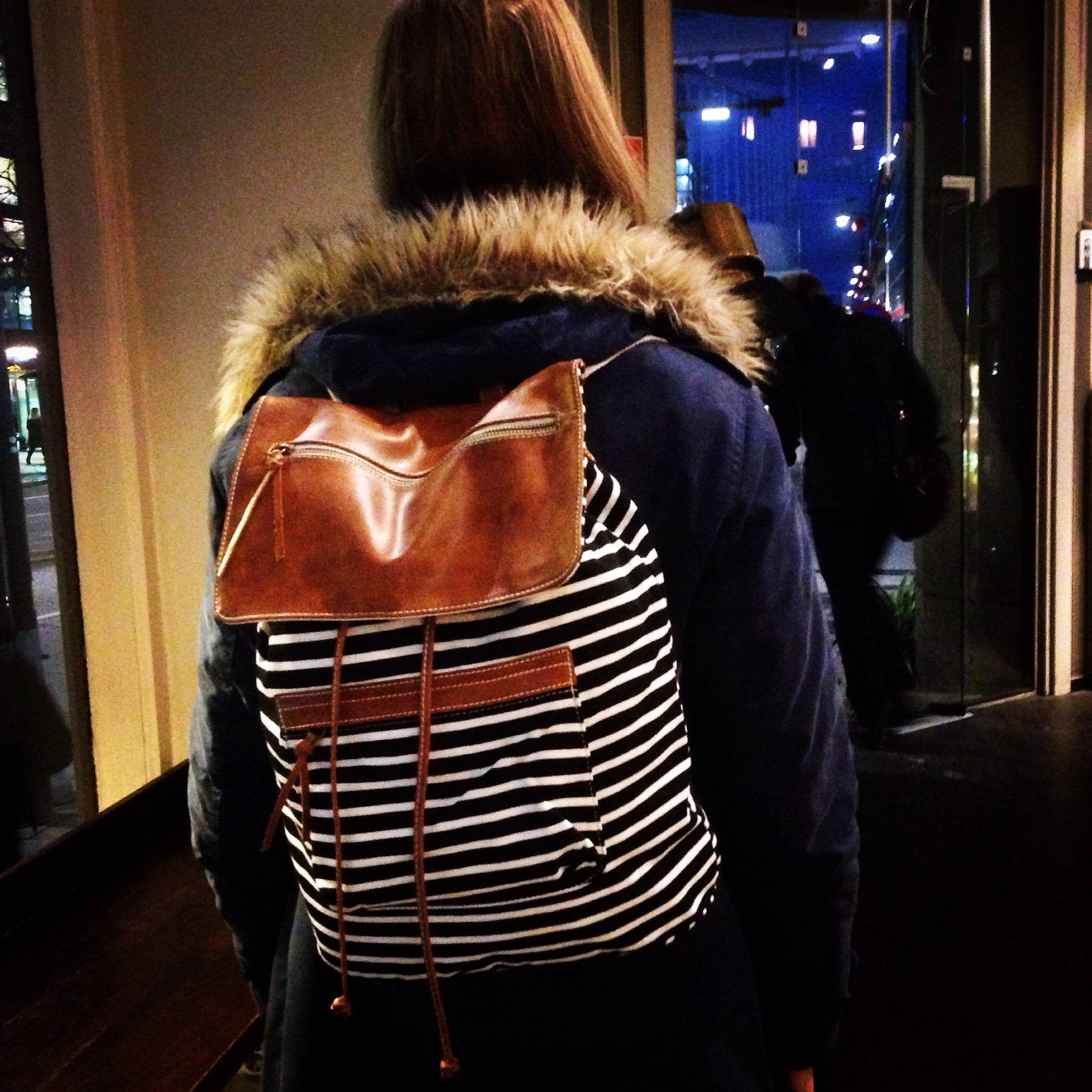Jag har en gammal ryggsäck som jag köpte i Barcelona och den rymmer hur mycket som helst och är ändå skön, den har varit på weekends i Jerusalem och Damaskus, jag ”stor”handlar (för att vara jag) i den på Ica och den har burit skolböcker. Irriterande nog har själva hängarna till dragkedjan gått sönder, förvånansvärt störande och krångligt i proportion till felet. Så har det varit i flera år tills jag för några dagar sedan kom på en genialisk idé. Mot pyssellådan och knappsamlingen och tadaa, funkar perfekt!