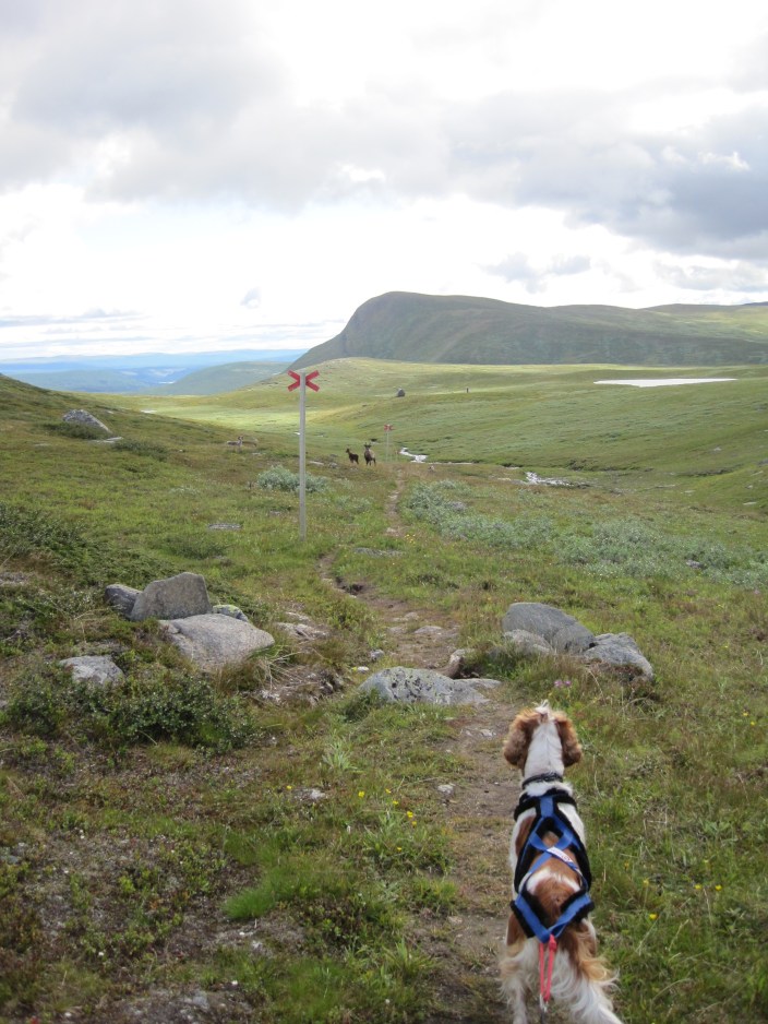 Efter sex dagar ihopselade är det inte konstigt att vi är tajta och igårkväll hade benen vilat tillräckligt och vi gav oss iväg utan packning i högre tempo än senaste veckan. Egentligen försöker jag komma bort ifrån pass som är mellanlånga och mellansnabba för jag blir aldrig varken uthålligare eller snabbare, men jag tänkte bara springa ur benen lite och se hur fötterna kändes efter så många dagars vandring. Jag kom också att tänka på ett tips jag läst om löpsteg – längd vs. Frekvens – som fick mig att titta till mitt eget och jag testade att bara luta mig lite mer framåt och tänka ”sparka bak” istället för att springa upprätt och pendla fram lite med fötterna för det ger mig en falsk känsla av att det går lätt och att jag tar långa steg. Det är inte riktigt effektiva steg. Att luta lite framåt, jag tänkte diagonalåkning i skidor, är ännu viktigare när man har en sele runt midjan har jag märkt. Det är lätt att man blir bromsklossen som håller sig upprätt och håller koll så ingen ska snubbla. Det handlar bara om möjligen centimetrar, men det kändes skillnad, och det gick betydligt snabbare än vanligt.