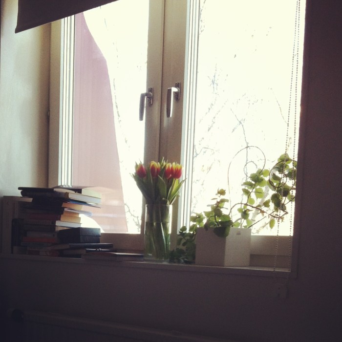Och jag hade så tur att jag lärt mig något ur en deckare. Förra fredagen köpte jag tulpaner till mamma, glömde ta med dem och insåg det på söndagen när jag kom hem och de låg på bänken. Då var jag redan på väg till Stockholm så jag tänkte några svordomar, kikade ner i påsen och såg att de inte hunnit slå ut så mycket, de såg i stort sett ut som på affären. Fick en idé och stoppade dem längst upp i kylen. Någon som läst 3 sekunder av Roslund och Hellström? Till er som gjort det kan jag berätta att researchen var äkta, när jag kom hem och hittade tulpanerna igen och snittade och stoppade dem i vatten så var de hur fräscha som helst. De hade inte börjat varken slå ut eller vissna i kylen, snarare tvärtom. Tänka sig vad man kan lära av den undre världen.