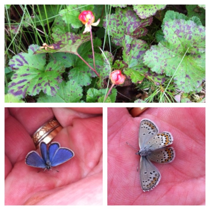 Jag har spenderat dagen med att gå in mina nya vandringsskor, träna mig och hunden, surra med pappa om funktionskläder, trangiakök, lumparminnen och tittat på växter, bär och djur. Vi var helt säkra på blåbär, hjortron och huggorm. Fjärilar och några gula blommor är vi lite mer osäkra på.