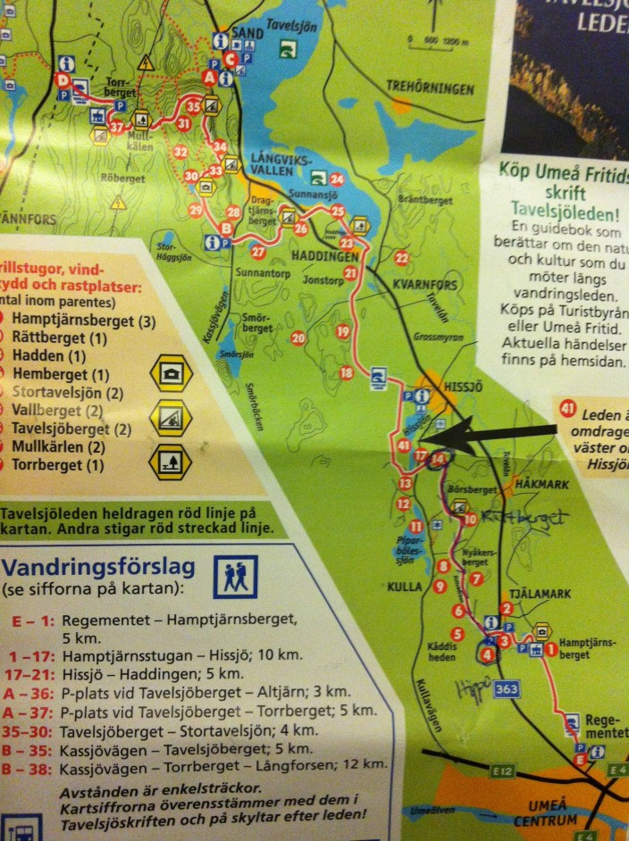 Länk till Tavelsjöleden med pdf här, där är Rättberget utmärkt men inte siffrorna. Det finns kartor i pappersformat att ta med sig vid parkeringen i hissjö där vi startade. Det här är långt ifrån någon svår rutt så ännu bättre info (eller slippa lägga ihop den till en helhetsbild själv) hade inte skadat, men å andra sidan är det ju en del av utmaningen att leta sig fram, hitta rastplatser och titta på kartan!