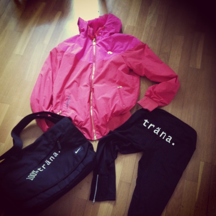 Precis som jag skrivit att det är svårt hitta träningskläder på loppis och second hand så hade Tränas instruktörer loppis i en av salarna idag. Träningstajts med ”träna” på som jag suktat efter länge, en cykelväska för träningsgrejer som jag verkligen känt mer och mer behov av senaste veckornas cyklande till simhallen, ofta efter jobbet eller via någon annanstans, och så en riktigt snygg vindjacka från Nike och Les Mills. Kan inte bli bättre.Vill bara träna mer och mer. Gjorde ett test på iksus hemsida igår om hur jag borde lägga upp min träning. Hör och häpna, svaret blev ”mer kondition”….. Klartecken från min idrottskunniga läkarkompis igår att det är inga problem vad gäller (läs: jag kan inte längre skylla på) mykoplasman, så det börjar väl bli dags testa alla nya kläder och all energi utomhus i löparspåret snart.