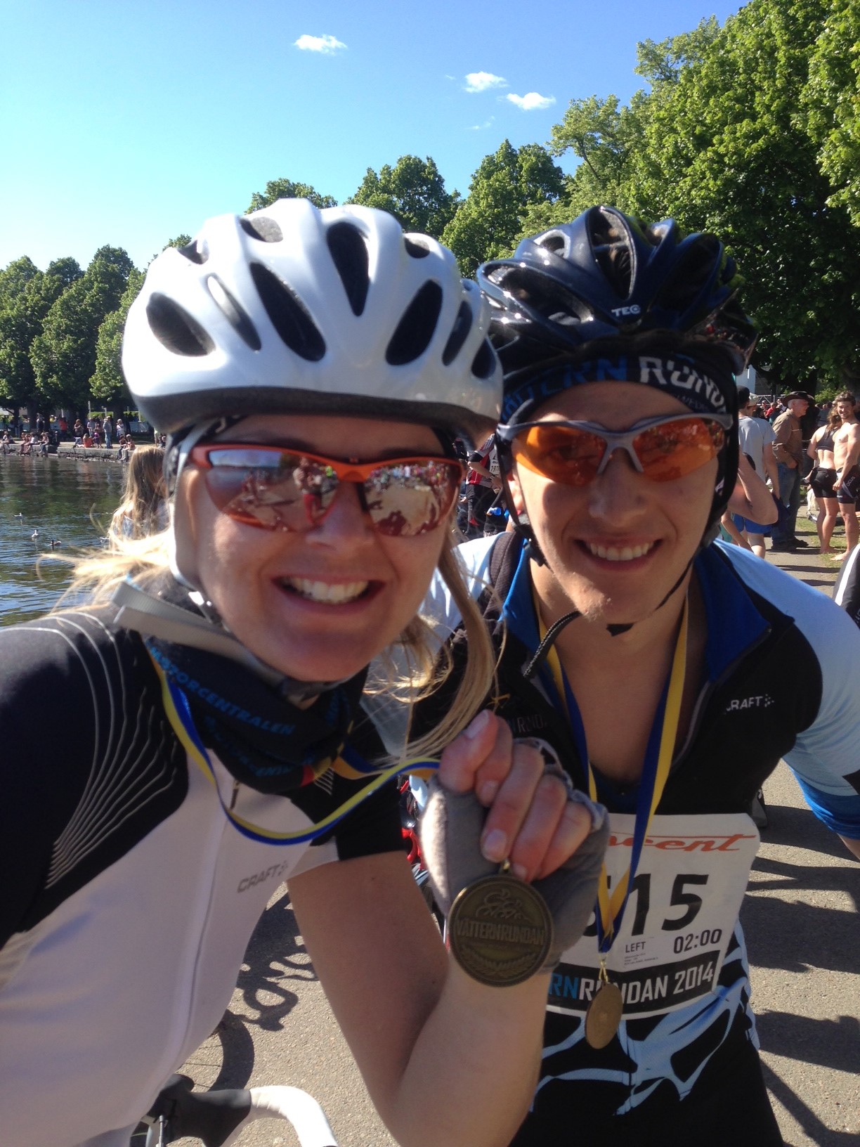 Till slut kom så skylten med 10 km kvar och vi närmade oss Motala på riktigt. Väl inne i centrum var det rena folkfesten, fantastisk stämning och folk som hejade och satt på kajen och solade, åt glass och cyklister som hoppat i Vättern för att svalka sig. 14 timmar och 21 minuter stannade klockan på och jag är mer än nöjd. Vi hade inget tidsmål men ungefär mellan 13-15 timmar kändes rimligt med tanke på vilken fart vi brukat träna i och att vi stannat i depåerna och ätit och sträckt på benen. Inga vurpor, inga skav (förutom på ena foten och ni skulle bara veta hur glad jag är att det är där och ingen annanstans) inte ens punka! Men mest glad är jag nog ändå att jag hade sällskap hela vägen runt!  Vätternrundan bild 2 (4)vätternrundan 2014