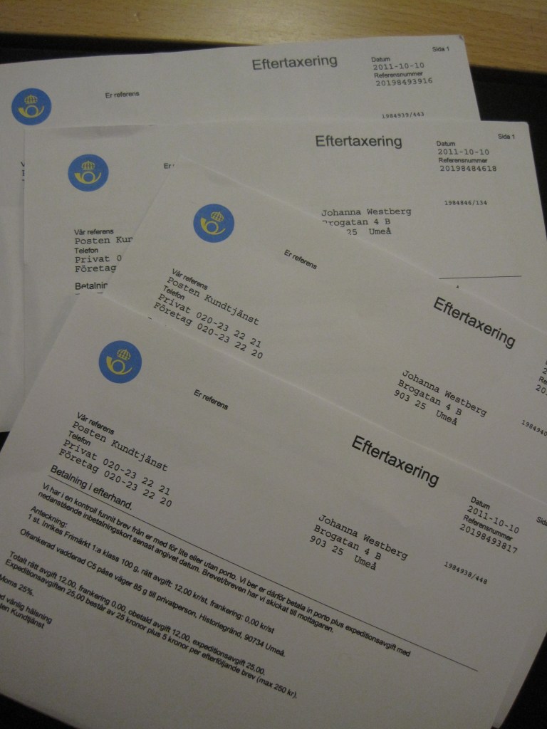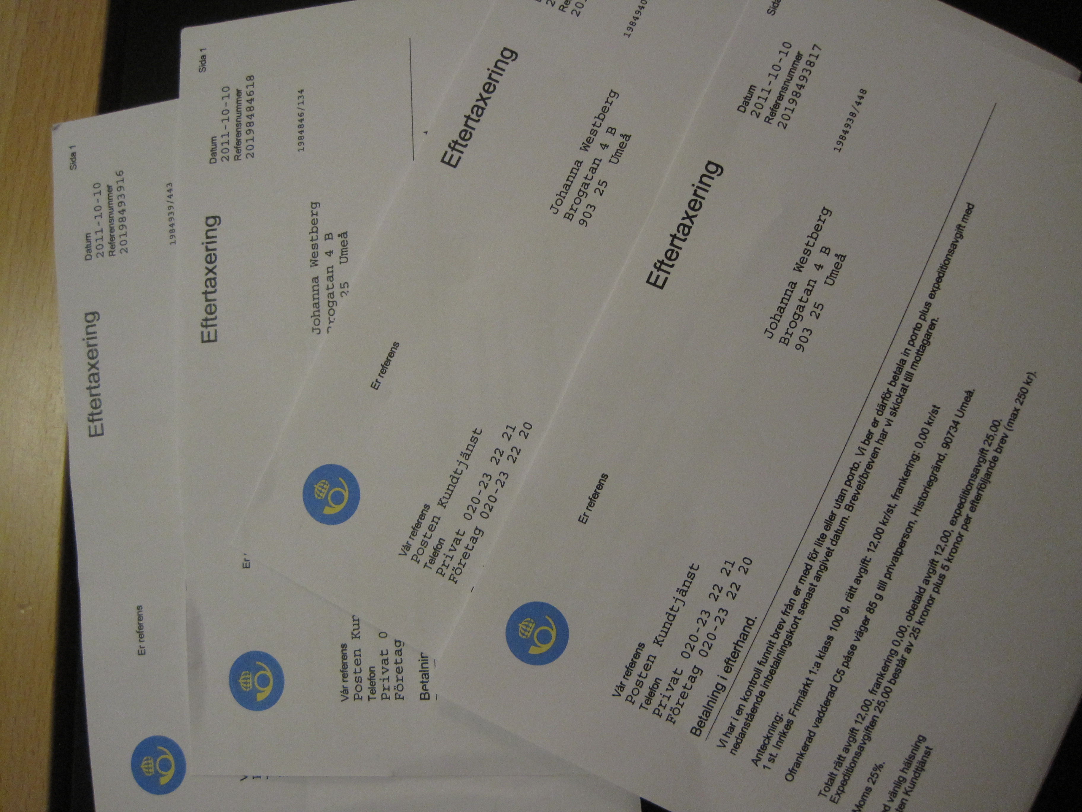 Två frimärken glömda, och fyra stycken för att skicka och upplysa om det. Admintid, papper, telefonsasmtal till kundtjänst etc. Ja man hurrar för att vi har en post iallafall, inte alla som har det.